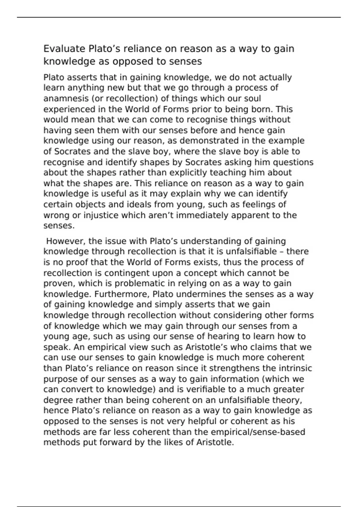 hence Plato’s reliance on reason as a way to gain knowledge as