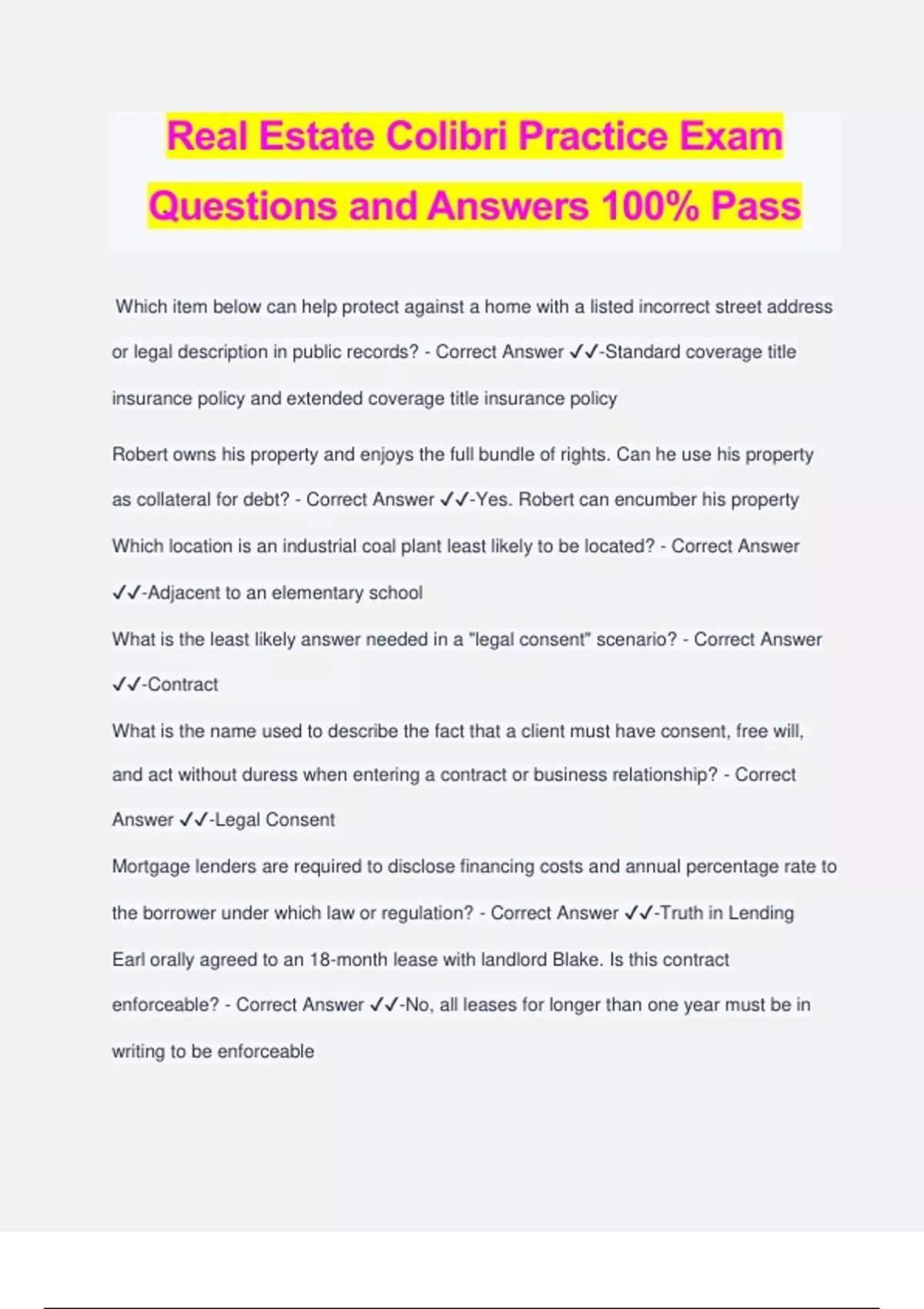 Real Estate Colibri Practice Exam Questions and Answers 100% Pass Which item below can help protect against a home with a listed incorrect street address or legal description in public records? - Correct Answer ️️ -Standard coverage title insurance policy and extended coverage title insurance policy Robert owns his property and enjoys the full bundle of rights. Can he use his property as collateral for debt? - Correct Answer ️️ -Yes. Robert can encumber his property Which location is an industrial coal plant least likely to be located? - Correct Answer ️️ -Adjacent to an elementary school What is the least likely answer needed in a "legal consent" scenario? - Correct Answer ️️ -Contract What is the name used to describe the fact that a client must have consent, free will, and act without duress when entering a contract or business relationship? - Correct Answer ️️ -Legal Consent Mortgage lenders are required to disclose financing costs and annual percentage rate to the borrower under which law or regulation? - Correct Answer ️️ -Truth in Lending Earl orally agreed to an 18-month lease with landlord Blake. Is this contract enforceable? - Correct Answer ️️ -No, all leases for longer than one year must be in writing to be enforceable Jessica can only afford a 7% down payment on her new cottage. What will she be required to purchase at closing? - Correct Answer ️️ -Private Mortgage Insurance What happens if the Grievance Committee finds that there is a potential ethics violation and that the complaint has been appropriately filed? - Correct Answer ️️ -The complaint is forwarded to a hearing panel of the Professional Standards Committee Listing agents must present ________. - Correct Answer ️️ -All formal and informal offers Which of the following principles are included in the Preamble to the Code of Ethics? - Correct Answer ️️ -Honesty and Integrity, Fairness, and Moral conduct in business relations What type of agency cannot be revoked by the principal, nor is terminated if the principal dies? - Correct Answer ️️ -Agency coupled with an interest Who can train office staff at a brokerage firm in weekly meetings? - Correct Answer ️️ - Principal Broker, associate brokers, and outside social media marketers What is the minimum earnest money deposit that a Buyer can offer to purchase a listed home? - Correct Answer ️️ -Zero dollars Which action does an escrow officer typically work on in a home sale transaction? - Correct Answer ️️ -Collects earnest money deposits, orders title insurance, and gathers third party inspection reports What was the original name of the National Association of REALTORS® when it was first founded? - Correct Answer ️️ -The National Association of Real Estate Exchanges What is "one click away" as it relates to the real estate profession? - Correct Answer ️️ -When a viewer online can find the agent's contact information with just one click of the mouse, smartphone, or keyboard A broker who spends their client's $10,000 earnest money deposit on their office's monthly expenses such as rent, utilities, and has engaged in the act of what? - Correct Answer ️️ -Conversion and Criminal Fraud Broker Joy just signed a listing agreement with a seller. When should Joy schedule an office tour? - Correct Answer ️️ -Within a week after the listing is taken Under the Rectangular survey system, which direction do the principal meridian lines run on a map? - Correct Answer ️️ -North-South According to Article 3, what does cooperating with other brokers involve? - Correct Answer ️️ -Sharing information about listings and making listings available for showing. Which of the following would be a type of authorized discipline that may be issued by NAR in the case of an ethics violation? - Correct Answer ️️ -Letter of Warning or Letter of Reprimand When an agent deposits their buyer's escrow funds into their personal account, then what is the action referred to under Agency Law? - Correct Answer ️️ -Commingling The Statute of Frauds usually requires or applies to _______. - Correct Answer ️️ - Written contracts, mutually voluntary legal agreements, and contracts without duress What does title insurance best protect against? - Correct Answer ️️ -past histories Who must a principal broker supervise in a real estate office? - Correct Answer ️️ -All licensees affiliated to the principal broker and all other unlicensed employees at that office. A residential REALTOR® with no commercial real experience has a new client who wants her to list his commercial real estate. What must the REALTOR® do before taking the listing? - Correct Answer ️️ -Inform the client of h