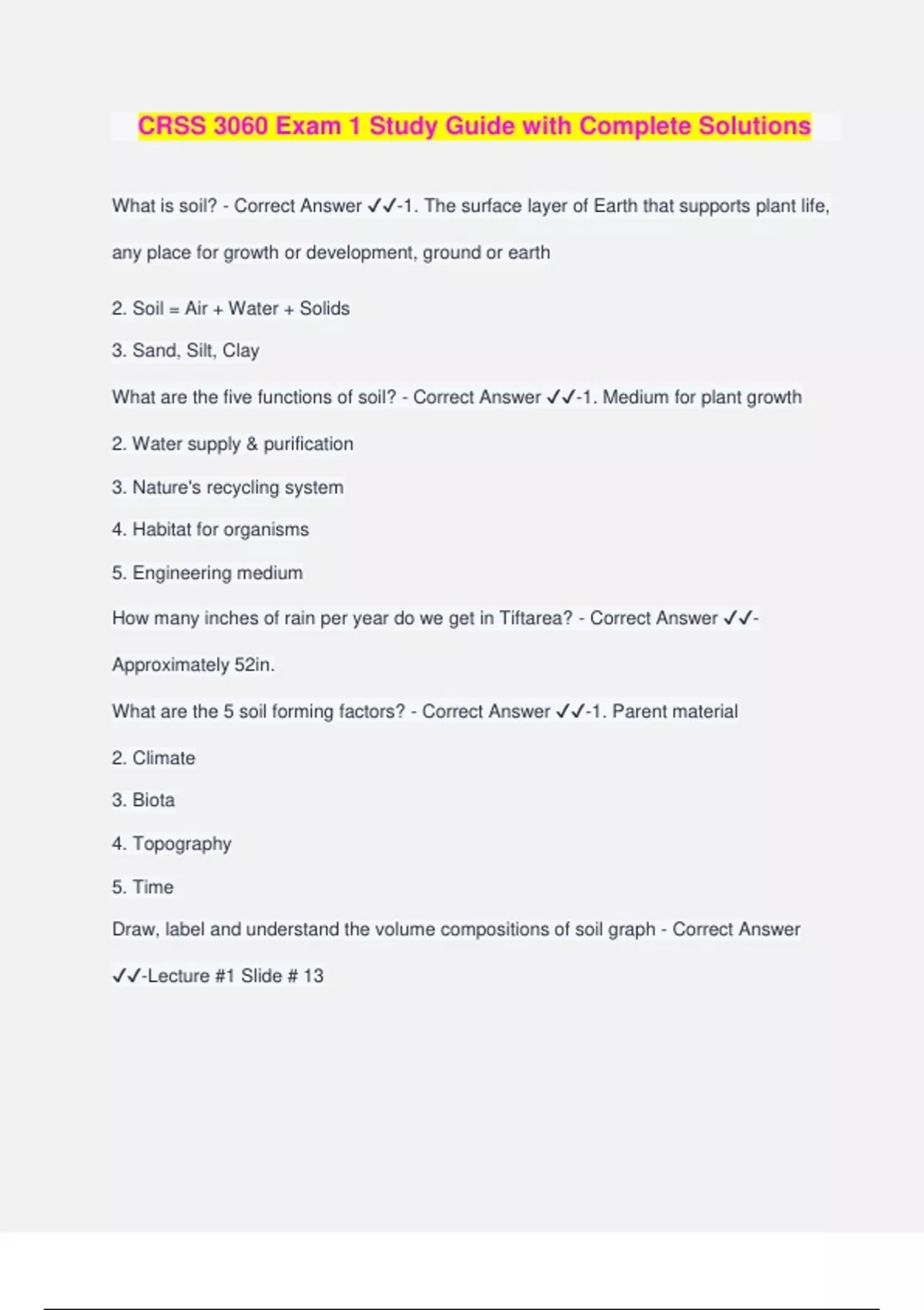 CRSS 3060 Exam 1 Study Guide with Complete Solutions What is soil? - Correct Answer ️️ -1. The surface layer of Earth that supports plant life, any place for growth or development, ground or earth 2. Soil = Air + Water + Solids 3. Sand, Silt, Clay What are the five functions of soil? - Correct Answer ️️ -1. Medium for plant growth 2. Water supply & purification 3. Nature's recycling system 4. Habitat for organisms 5. Engineering medium How many inches of rain per year do we get in Tiftarea? - Correct Answer ️️ - Approximately 52in. What are the 5 soil forming factors? - Correct Answer ️️ -1. Parent material 2. Climate 3. Biota 4. Topography 5. Time Draw, label and understand the volume compositions of soil graph - Correct Answer ️️ -Lecture #1 Slide # 13 List and describe the 3 methods to measure soil texture as done in lab, from least complicate/least accurate to most complicated/most accurate - Correct Answer ️️ -1. Feel Test: touched the soil to feel the different textures 2. Shifting Method: put the soil through multiple layers that got finer as the layers went down 3. Hydrometer: placed in a glass column to measure the density used to calculate sand, silt, clay Name a physical, chemical and biological property of soil we will study in this course - Correct Answer ️️ -1. Physical: texture, density 2. Chemical: pH, CEC, nutrients 3. Biological: earthworms, microbial biomass What is the difference between soil texture and soil structure? What would be examples for each for both a topsoil and subsoil for south Geogria soil (we did in lab) - Correct Answer ️️ -1. Texture: the separates (sand, silt, clay) 2. Structure: how the separates are held together (blocky, platy, granular, and prismatic) Examples in lab: A. Topsoil: the texture was loamy sand and the structure was granular B. Subsoil: the texture was sandy loam and the structure was blocky Explain "Liebig's Law of the Minimum" - Correct Answer ️️ -'Weakest Link Theory'; plant growth is dictated by the lowest/scarcest factor How many essential plant nutrients are there according to Dr. Harris ? - Correct Answer ️️ -16 (CB HOPKNS CaFe Cl Mn Mo Co Zn Mg) How many feet are in an acre? - Correct Answer ️️ -43,560 feet How many pounds does an "acre furrow slice" weigh? - Correct Answer ️️ -2,000,000 lbs From Northwest to Southeast, name the 5 soil regions of Georgia - Correct Answer ️️ - 1. Mountain Valley 2. Piedmont 3. Sand Ridge 4. Coastal Plains 5.Flatwoods Name a state in the US where you are likely to find an alfisol, a mollisol, and ulttisol - Correct Answer ️️ -Ohio, Kansas, GA What is histosol? - Correct Answer ️️ -Organic 'muk' soils Describe south Georgia soil in terms of texture, pH, fertility, organic matter? It is considered a good soil? Why or why not? - Correct Answer ️️ -In general the state of GA is/has: 1. Ultisols 2. Highly weathered 3. Poorly buffered 4. Acidic 5. Low fertility 6. Low OM It isn't considered a 'good' soil Name 5 physical properties of soil(listed in lecture) - Correct Answer ️️ -1. Color 2. Texture 3. Structure 4. Pore space 5. Strength What does color of soil tell you? - Correct Answer ️️ -Clues on drainage, OM, and water content Do a rough drawing of the soil texture triangle, label and number the sides and inc