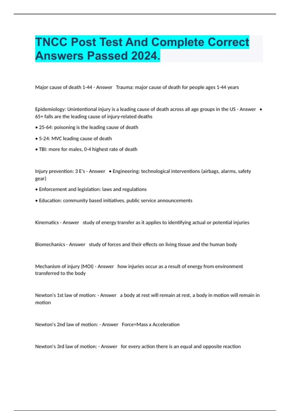 Major cause of death 1-44 - Answer Trauma: major cause of death for people ages 1-44 years Epidemiology: Unintentional injury is a leading cause of death across all age groups in the US - Answer • 65+ falls are the leading cause of injury-related deaths • 25-64: poisoning is the leading cause of death • 5-24: MVC leading cause of death • TBI: more for males, 0-4 highest rate of death Injury prevention: 3 E's - Answer • Engineering: technological interventions (airbags, alarms, safety gear) • Enforcement and legislation: laws and regulations • Education: community based initiatives, public service announcements Kinematics - Answer study of energy transfer as it applies to identifying actual or potential injuries Biomechanics - Answer study of forces and their effects on living tissue and the human body Mechanism of injury (MOI) - Answer how injuries occur as a result of energy from environment transferred to the body Newton's 1st law of motion: - Answer a body at rest will remain at rest, a body in motion will remain in motion Newton's 2nd law of motion: - Answer Force=Mass x Acceleration Newton's 3rd law of motion: - Answer for every action there is an equal and opposite reaction