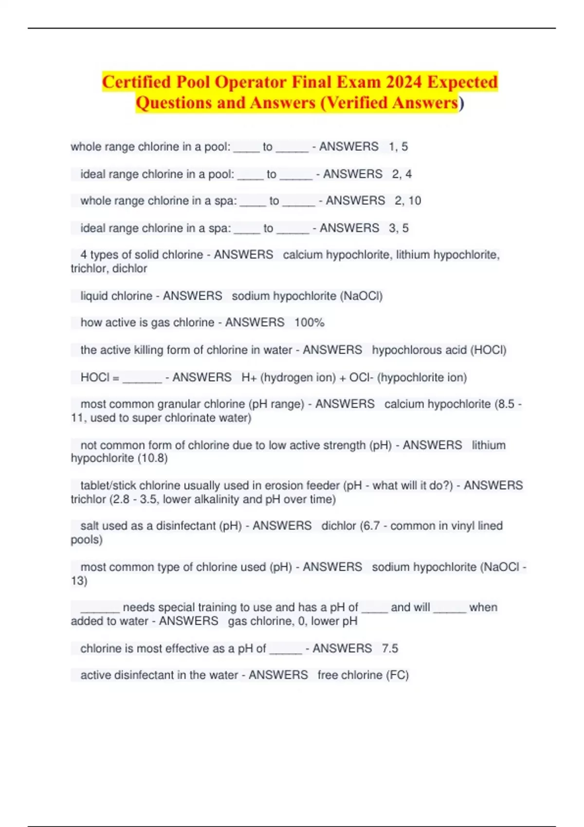 Certified Pool Operator Final Exam 2024 Expected Questions and Answers (Verified Answers)