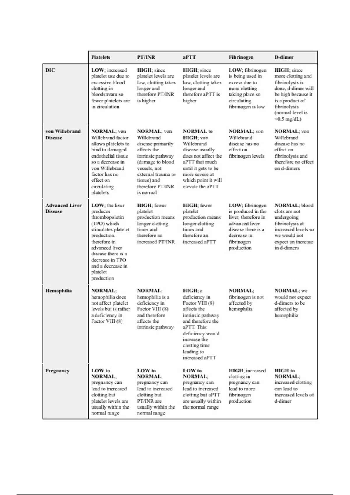 This study guide covers common platelet disorders such as von Willebrand Disease, DIC, and hemophilia and the levels of platelets, PT/aPTT, fibrinogen, and D-dimer.