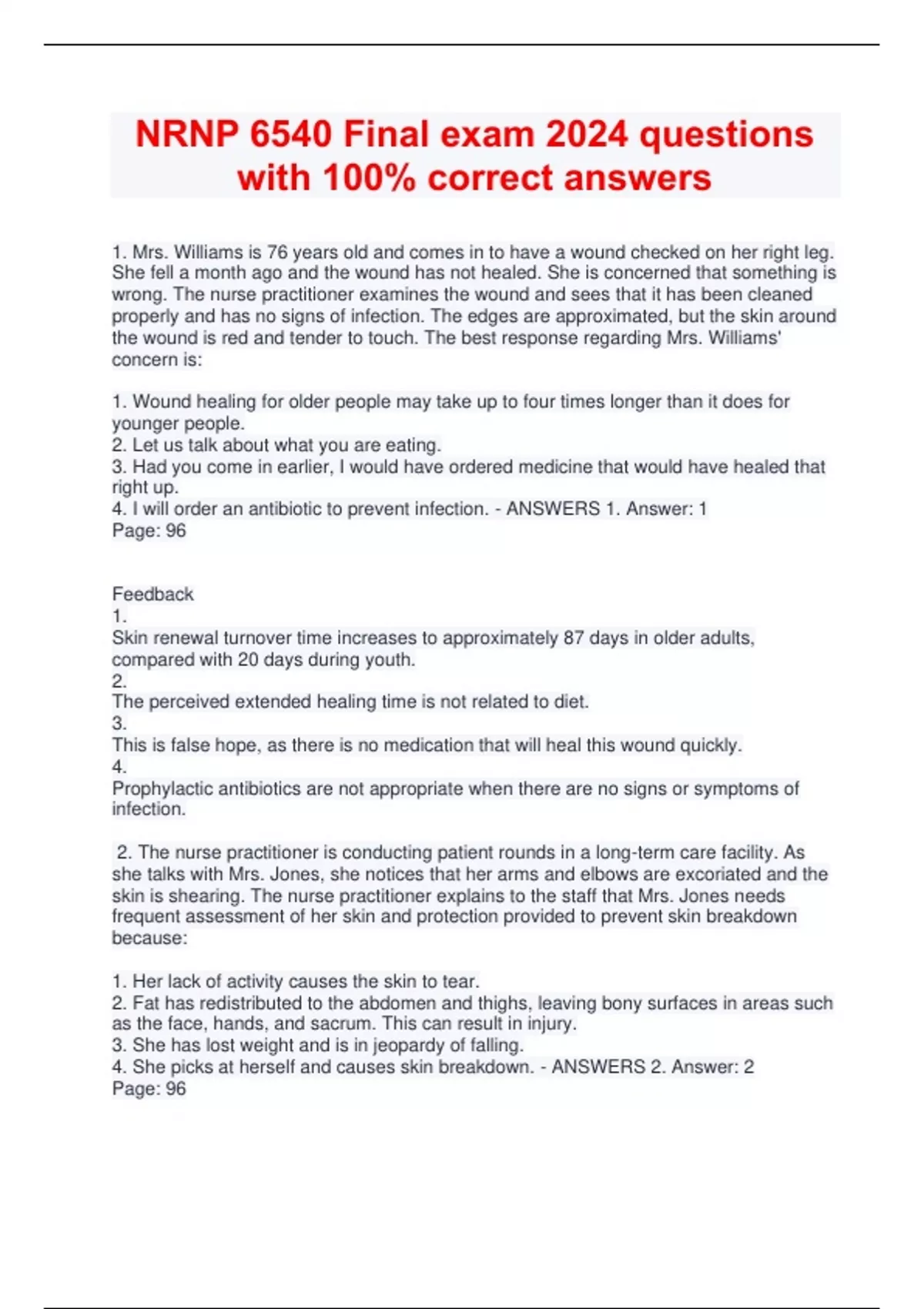 NRNP 6540 Final exam 2024 questions with 100% correct answers 1. Mrs. Williams is 76 years old and comes in to have a wound checked on her right leg. She fell a month ago and the wound has not healed. She is concerned that something is wrong. The nurse practitioner examines the wound and sees that it has been cleaned properly and has no signs of infection. The edges are approximated, but the skin around the wound is red and tender to touch. The best response regarding Mrs. Williams' concern is: 1. Wound healing for older people may take up to four times longer than it does for younger people. 2. Let us talk about what you are eating. 3. Had you come in earlier, I would have ordered medicine that would have healed that right up. 4. I will order an antibiotic to prevent infection. - ANSWERS 1. Answer: 1 Page: 96 Feedback 1. Skin renewal turnover time increases to approximately 87 days in older adults, compared with 20 days during youth. 2. The perceived extended healing time is not related to diet. 3. This is false hope, as there is no medication that will heal this wound quickly. 4. Prophylactic antibiotics are not appropriate when there are no signs or symptoms of infection. 2. The nurse practitioner is conducting patient rounds in a long-term care facility. As she talks with Mrs. Jones, she notices that her arms and elbows are excoriated and the skin is shearing. The nurse practitioner explains to the staff that Mrs. Jones needs frequent assessment of her skin and protection provided to prevent skin breakdown because: 1. Her lack of activity causes the skin to tear. 2. Fat has redistributed to the abdomen and thighs, leaving bony surfaces in areas such as the face, hands, and sacrum. This can result in injury. 3. She has lost weight and is in jeopardy of falling. 4. She picks at herself and causes skin breakdown. - ANSWERS 2. Answer: 2 Page: 96 Feedback 1. Lack of activity alone does not cause skin breakdown. 2. Fat is redistributed to the abdomen and thighs, leaving bony surfaces, such as the face, hands, and sacrum, exposed to potential injury, especially skin tears from shearing, friction forces and pressure ulcer development. 3. Although losing weight may be a risk factor for falling, it is not directly related to skin breakdown. 4. There is no evidence that she is picking at herself, as there is nothing reported anywhere else on her arms. 3. Mr. James is 91 years old. His daughter notices that he has bruises and lacerations on his arms and reports this to the nurse practitioner, who tells her that older people bruise easily due to their fragile blood vessels. The skin lacerations happen because he has thin skin. Even so, the nurse practitioner assures the daughter that she will investigate further to ensure that he is getting proper care. She says this because she understands that: 1. These markings on the patient's skin are part of aging skin. 2. Bruises and lacerations can indicate inadequate care. 3. The daughter needs assurance that her father is okay. 4. The patient is being abused. - ANSWERS 3. Answer: 2 Page: 97 Feedback 1. Markings on the skin may be signs of aging, a disease, or maltreatment. 2. Poorly healing wounds or chronic pressure ulcers may signal a problem not only with the patient but with the caregiver's ability to provide adequate care. Welts, lacerations, burns, and distinctive markings may indicate a need for intervention. 3. This is a result of the nurse practitioner addressing it further rather than the reason for addressing it. 4. A professional cannot assume abuse without good reason. 4. The nurse practitioner assesses a patient's skin and finds an infectious lesion on the lower leg. The lesion is considered a secondary lesion. The nurse practitioner explains that a secondary lesion is one that: 1. Arises from changes to a primary lesion. 2. Is a complication of an underlying disease. 3. Is difficult to treat. 4. Is a normal sign of aging. - ANSWERS 4. Answer: 1 Page: 97 Feedback 1. Secondary lesions (infections) arise from changes to the primary lesion. 2. Secondary lesions are not necessarily the result of an underlying disease. 3. Secondary lesions can be treated with medications or surgery. 4. Secondary lesions arise as a condition not normal t