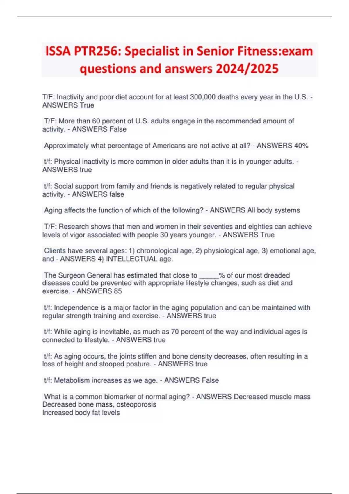 ISSA PTR256: Specialist in Senior Fitness:exam questions and answers 2024/2025 T/F: Inactivity and poor diet account for at least 300,000 deaths every year in the U.S. - ANSWERS True T/F: More than 60 percent of U.S. adults engage in the recommended amount of activity. - ANSWERS False Approximately what percentage of Americans are not active at all? - ANSWERS 40% t/f: Physical inactivity is more common in older adults than it is in younger adults. - ANSWERS true t/f: Social support from family and friends is negatively related to regular physical activity. - ANSWERS false Aging affects the function of which of the following? - ANSWERS All body systems T/F: Research shows that men and women in their seventies and eighties can achieve levels of vigor associated with people 30 years younger. - ANSWERS True Clients have several ages: 1) chronological age, 2) physiological age, 3) emotional age, and - ANSWERS 4) INTELLECTUAL age. The Surgeon General has estimated that close to _____% of our most dreaded diseases could be prevented with appropriate lifestyle changes, such as diet and exercise. - ANSWERS 85 t/f: Independence is a major factor in the aging population and can be maintained with regular strength training and exercise. - ANSWERS true t/f: While aging is inevitable, as much as 70 percent of the way and individual ages is connected to lifestyle. - ANSWERS true t/f: As aging occurs, the joints stiffen and bone density decreases, often resulting in a loss of height and stooped posture. - ANSWERS true t/f: Metabolism increases as we age. - ANSWERS False What is a common biomarker of normal aging? - ANSWERS Decreased muscle mass Decreased bone mass, osteoporosis Increased body fat levels Decreased aerobic capacity Which of the following is true regarding the three phases of the life span? - ANSWERS As a newborn, the longer one lives, the longer they are expected to live Between the ages of 10 and 40, the death rate is generally quite low Between the ages of 40 to 100, the mortality rate climbs very rapidly This programmed and metabolic theory states that a programmed decline in immune system functions leads to an increased vulnerability to infectious disease, resulting in greater age related characteristics that influence death. - ANSWERS Immunological theory t/f: The endocrine life span theory states that biological clocks act through hormones to control the pace of aging. - ANSWERS true What is the error theory example that states that cells and tissues have vital parts that wear out? - ANSWERS wear and tear T/F: The free radicals error theory states that accumulated damage caused by oxygen radicals causes cells, and eventually organs, to stop functioning. - ANSWERS true t/f: Between the ages of 45 and 65, men are more likely to die of heart disease and cancer than women. - ANSWERS true What is the leading cause of death in men age 65 and over? - ANSWERS heart disease t/f: Vital capacity may decline by about 40 percent between the ages of 20 and 70. - ANSWERS true Which of the following physiological variables increases with age? - ANSWERS body fat Type II muscle fibers (fast twitch) have been shown in some studies to decrease as much as ___% by the age of 80 in men who don't actively strength train. - ANSWERS 50% t/f: Hearing loss can begin as early as age 20. - ANSWERS true Which of the following brain conditions is prevalent in the aging population, and accounts for half of all reported cases of dementia? - ANSWERS Alzheimer's t/f: Most researchers suggest that we should not experience a steady decline in health until we are into our eighties. - ANSWERS true t/f: Twelve percent of deaths in Americans can be indirectly related to hypokinetic disease. - ANSWERS true Many of the deleterious effects associated with aging are now being found to be the end result of the effects of hypo-kinetic disease, which is also known as the "___________" syndrome. - ANSWERS couch potato Which of the following is a cardiac risk factor? - ANSWERS obesity high blood pressure smoking Which of the following is NOT a benefit seen in the cardiovascular system with exercise? - ANSWERS increase in resting