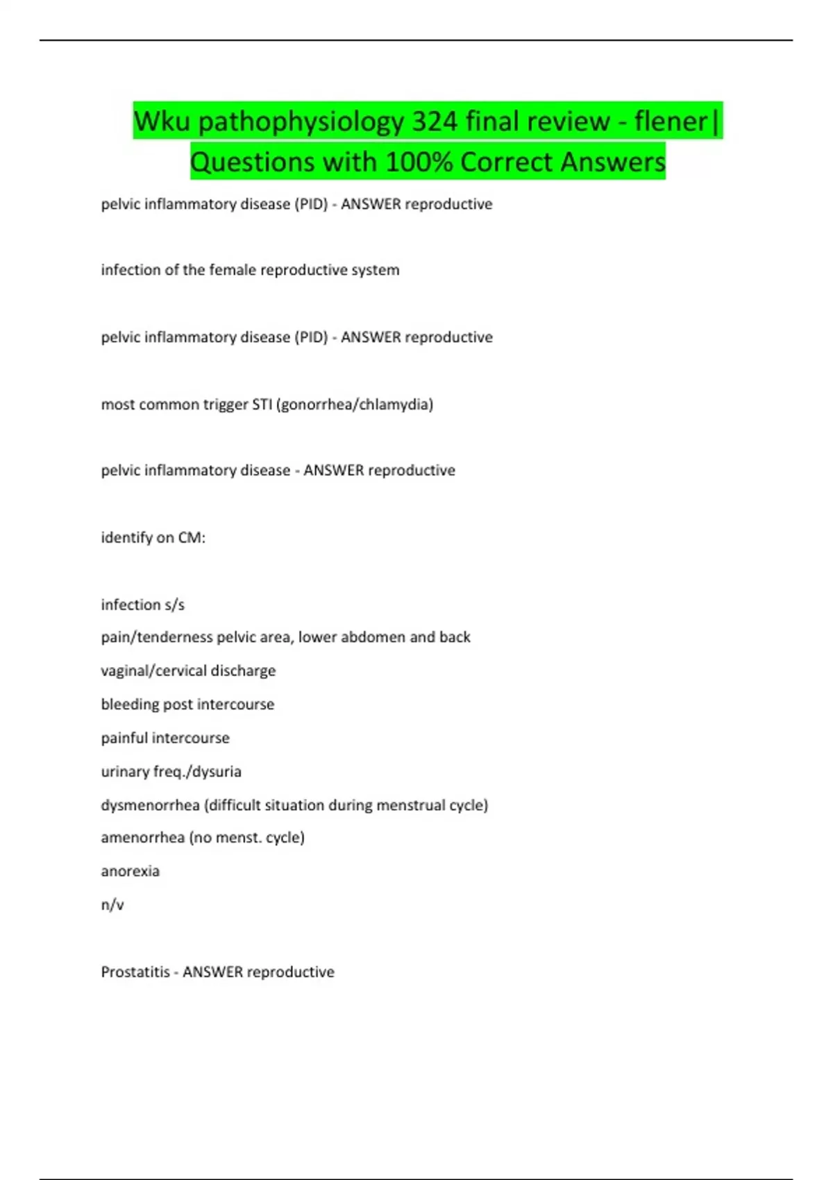 pelvic inflammatory disease (PID) - ANSWER reproductive infection of the female reproductive system pelvic inflammatory disease (PID) - ANSWER reproductive most common trigger STI (gonorrhea/chlamydia) pelvic inflammatory disease - ANSWER reproductive identify on CM: