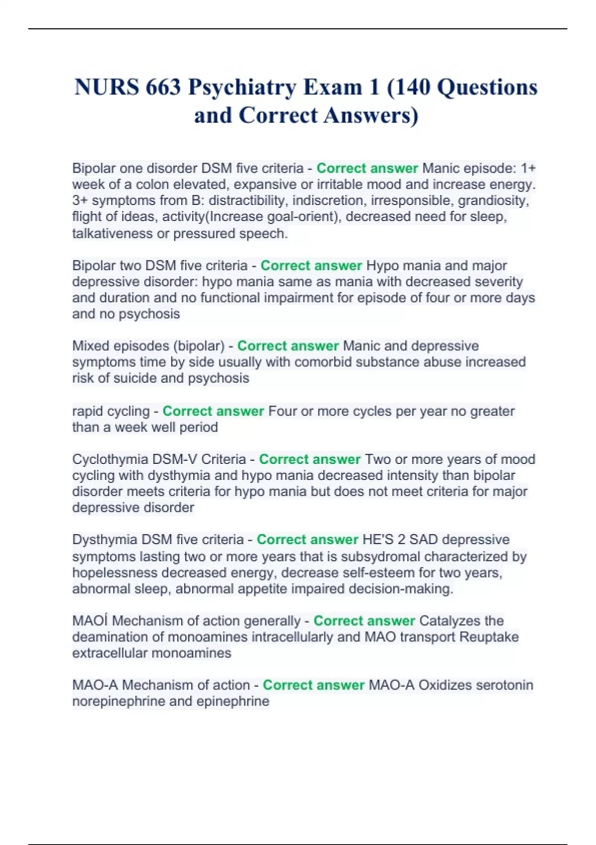NURS 663 Psychiatry Exam 1.NURS 663 Psychiatry Exam 1.