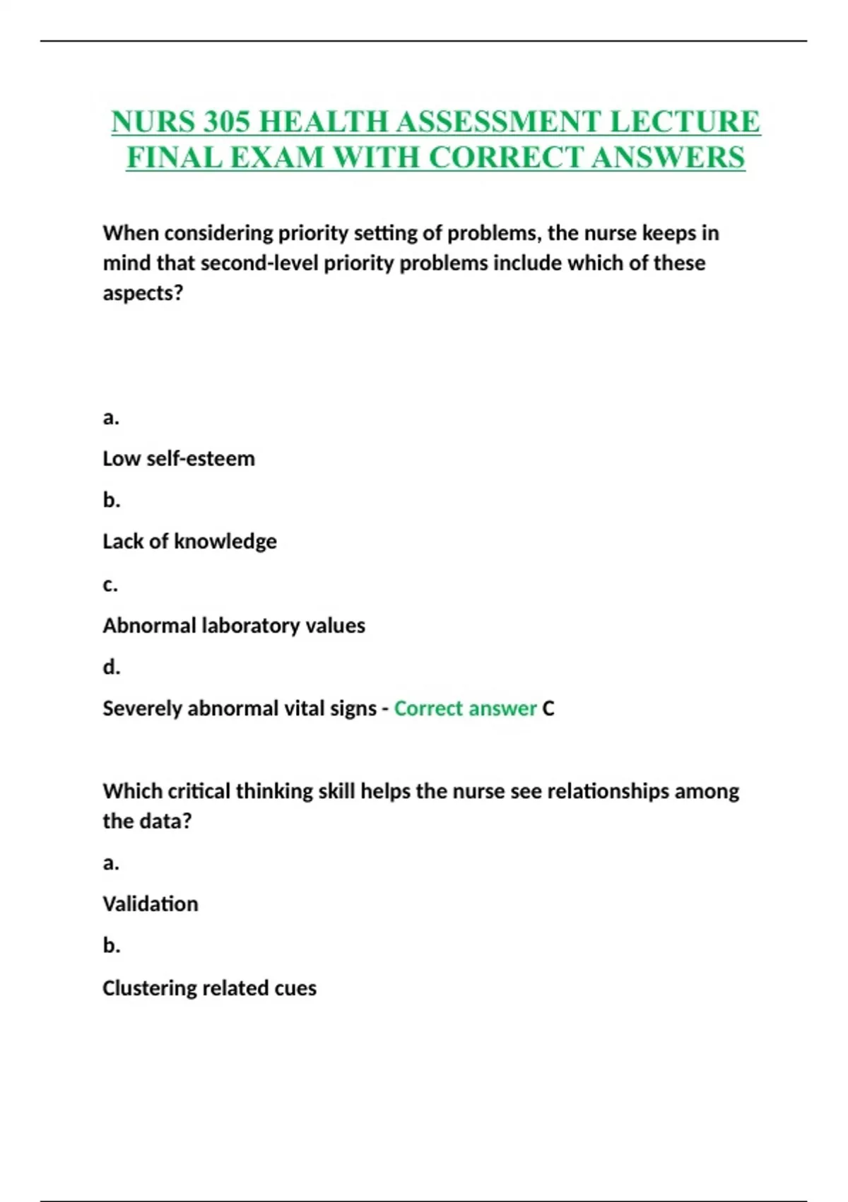 NURS 305 HEALTH ASSESSMENT LECTURE FINAL EXAM WITH CORRECT ANSWERS.
