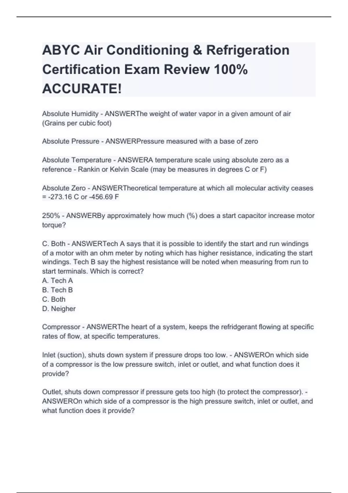 Absolute Humidity - ANSWERThe weight of water vapor in a given amount of air (Grains per cubic foot) Absolute Pressure - ANSWERPressure measured with a base of zero Absolute Temperature - ANSWERA temperature scale using absolute zero as a reference - Rankin or Kelvin Scale (may be measures in degrees C or F) Absolute Zero - ANSWERTheoretical temperature at which all molecular activity ceases = -273.16 C or -456.69 F 250% - ANSWERBy approximately how much (%) does a start capacitor increase motor torque? C. Both - ANSWERTech A says that it is possible to identify the start and run windings of a motor with an ohm meter by noting which has higher resistance, indicating the start windings. Tech B say the highest resistance will be noted when measuring from run to start terminals. Which is correct? A. Tech A B. Tech B C. Both D. Neigher Compressor - ANSWERThe heart of a system, keeps the refridgerant flowing at specific rates of flow, at specific temperatures. Inlet (suction), shuts down system if pressure drops too low. - ANSWEROn which side of a compressor is the low pressure switch, inlet or outlet, and what function does it provide?