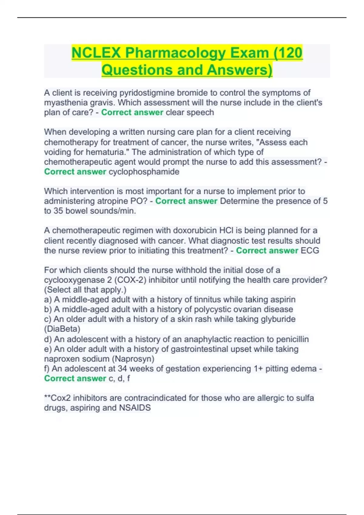 NCLEX Pharmacology Exam (120 Questions and Answers).NCLEX Pharmacology Exam (120 Questions and Answers).
