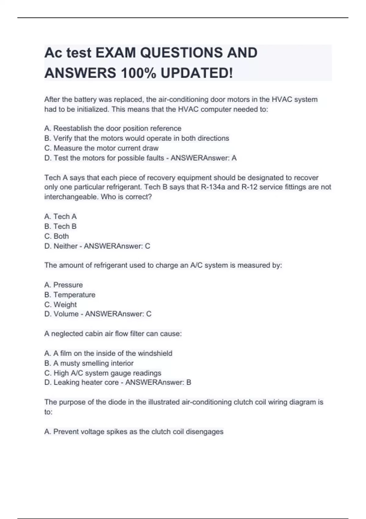 After the battery was replaced, the air-conditioning door motors in the HVAC system had to be initialized. This means that the HVAC computer needed to: A. Reestablish the door position reference B. Verify that the motors would operate in both directions C. Measure the motor current draw D. Test the motors for possible faults - ANSWERAnswer: A Tech A says that each piece of recovery equipment should be designated to recover only one particular refrigerant. Tech B says that R-134a and R-12 service fittings are not interchangeable. Who is correct? A. Tech A B. Tech B C. Both D. Neither - ANSWERAnswer: C The amount of refrigerant used to charge an A/C system is measured by: A. Pressure B. Temperature C. Weight D. Volume - ANSWERAnswer: C A neglected cabin air flow filter can cause: A. A film on the inside of the windshield B. A musty smelling interior C. High A/C system gauge readings D. Leaking heater core - ANSWERAnswer: B The purpose of the diode in the illustrated air-conditioning clutch coil wiring diagram is to: A. Prevent voltage spikes as the clutch coil disengages