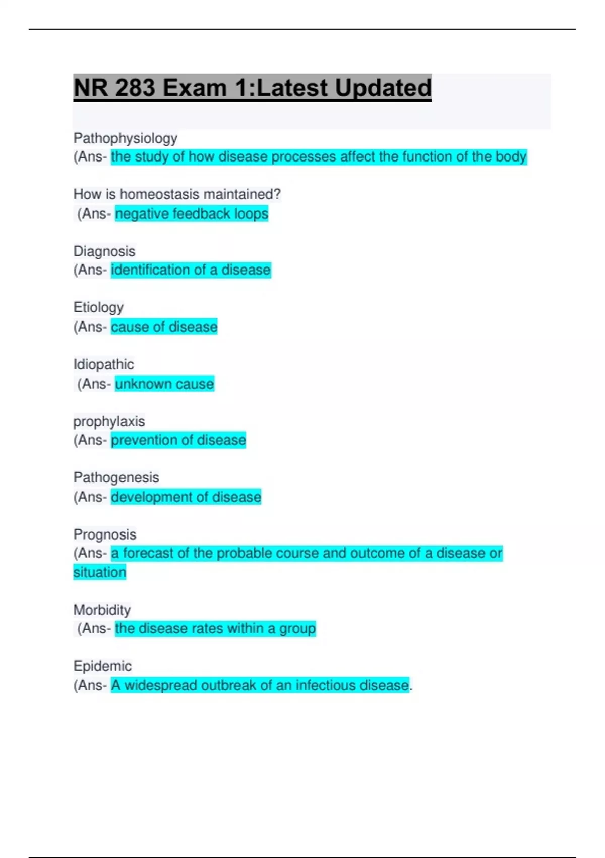 Pathophysiology (Ans- the study of how disease processes affect the function of the body How is homeostasis maintained? (Ans- negative feedback loops Diagnosis (Ans- identification of a disease Etiology (Ans- cause of disease Idiopathic (Ans- unknown cause prophylaxis (Ans- prevention of disease Pathogenesis (Ans- development of disease Prognosis (Ans- a forecast of the probable course and outcome of a disease or situation Morbidity (Ans- the disease rates within a group Epidemic (Ans- A widespread outbreak of an infectious disease.