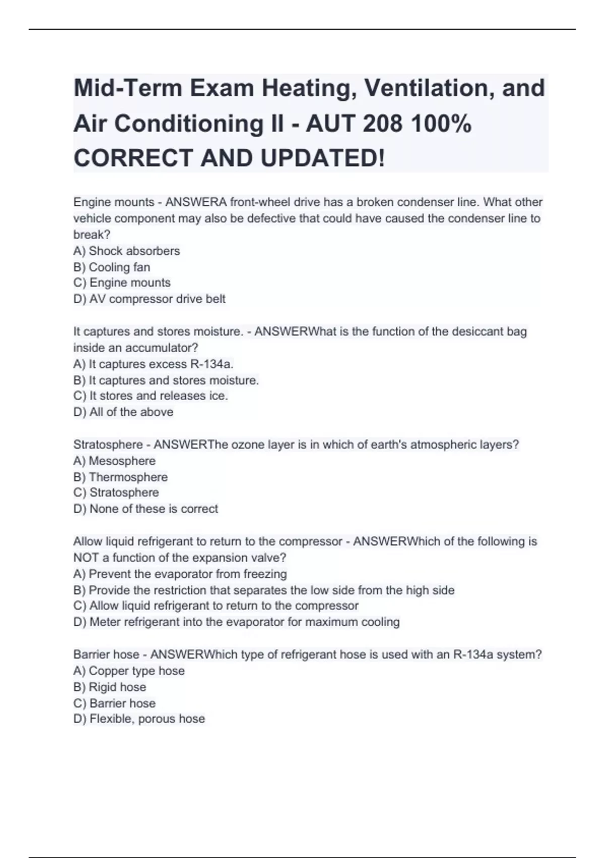 Mid-Term Exam Heating, Ventilation, and Air Conditioning II - AUT 208 100% CORRECT AND UPDATED!