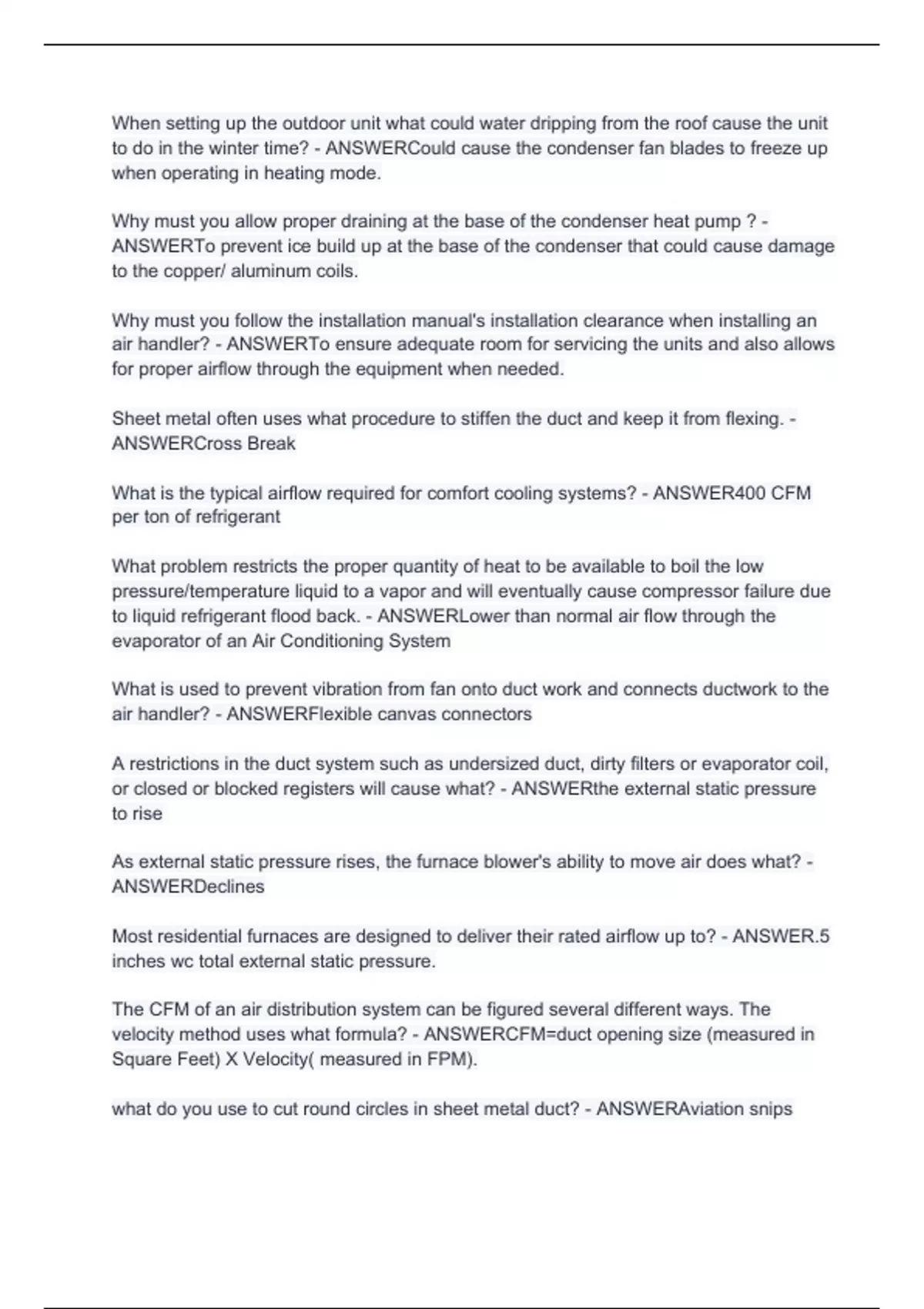 what will using too large of a piston in a FCC (flow check control) type metering device cause? - ANSWERit will lead to too much liquid in the evaporator and could cause liquid flood back to the compressor when starting up a compressor you hear only humming from the compressor and then tripped internal overload. What might be the problem - ANSWERhe most common problem to find will be a faulty Potential Start Relay. If the relay and start capacitor test out good, then the compressor is probably locked up mechanically. too low of delta-t across an evaporator could mean what - ANSWERtoo high of air flow where is the accumulator located on a heat pump and where is it located on a normal unit - ANSWERthe true suction line between the middle connection of the Reversing Valve and the Compressor inlet. and the suction line before the compressor why must you keep the bottom of the condenser clean on a heat pump - ANSWERso that defrost water can drain away from the coil. what is the formula to find the CFM - ANSWERVelocity (FPM) X Free Air Area (Sq Feet) know how to read the friction chart to calculate air flow - ANSWERask burdette