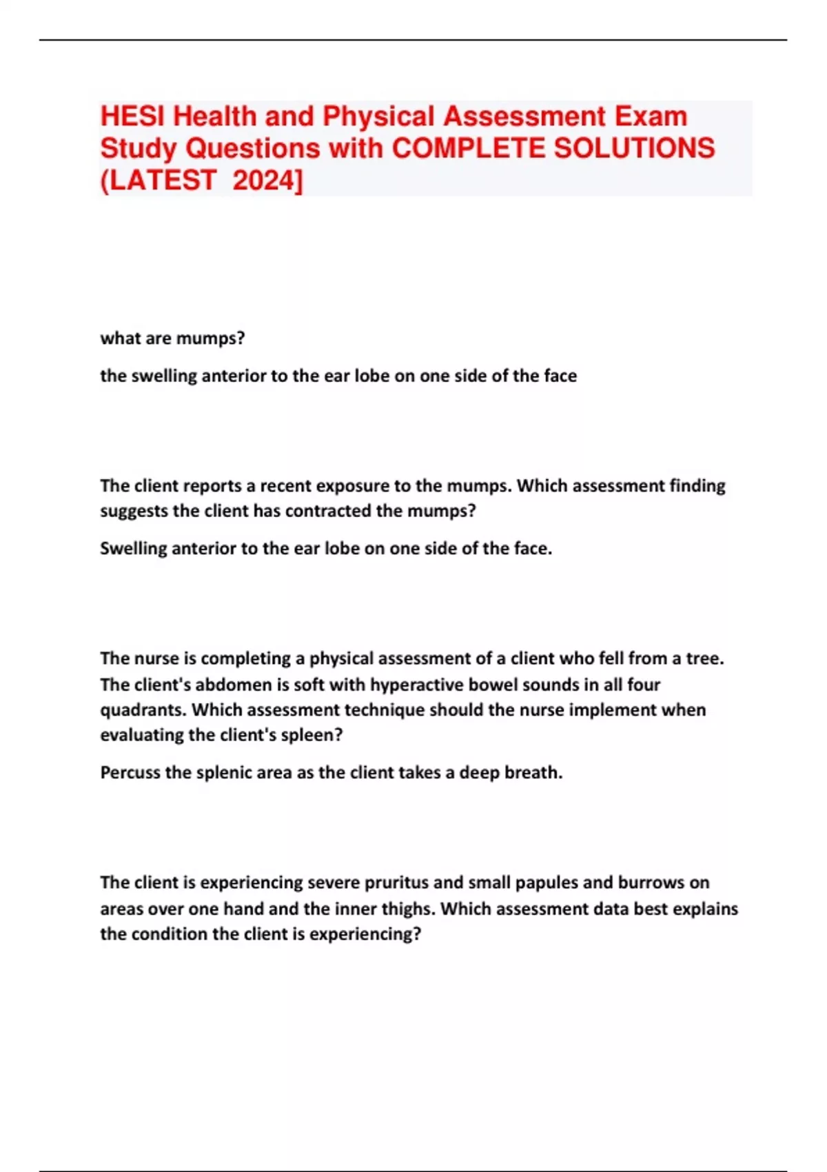 HESI Health and Physical Assessment Exam Study Questions with COMPLETE SOLUTIONS (LATEST 2024] what are mumps? the swelling anterior to the ear lobe on one side of the face The client reports a recent exposure to the mumps. Which assessment finding suggests the client has contracted the mumps? Swelling anterior to the ear lobe on one side of the face. The nurse is completing a physical assessment of a client who fell from a tree. The client's abdomen is soft with hyperactive bowel sounds in all four quadrants. Which assessment technique should the nurse implement when evaluating the client's spleen? Percuss the splenic area as the client takes a deep breath. The client is experiencing severe pruritus and small papules and burrows on areas over one hand and the inner thighs. Which assessment data best explains the condition the client is experiencing? The client works in a daycare setting that has had a scabies outbreak. A male client is seen in the primary care clinic for a physical examination. While obtaining the client's health history, the nurse inquires about his drug and alcohol use. The client denies drug use but reports that he has "two glasses of wine" per night. Which response is best for the nurse to provide? "What effect do you think your use of alcohol may have on you?"