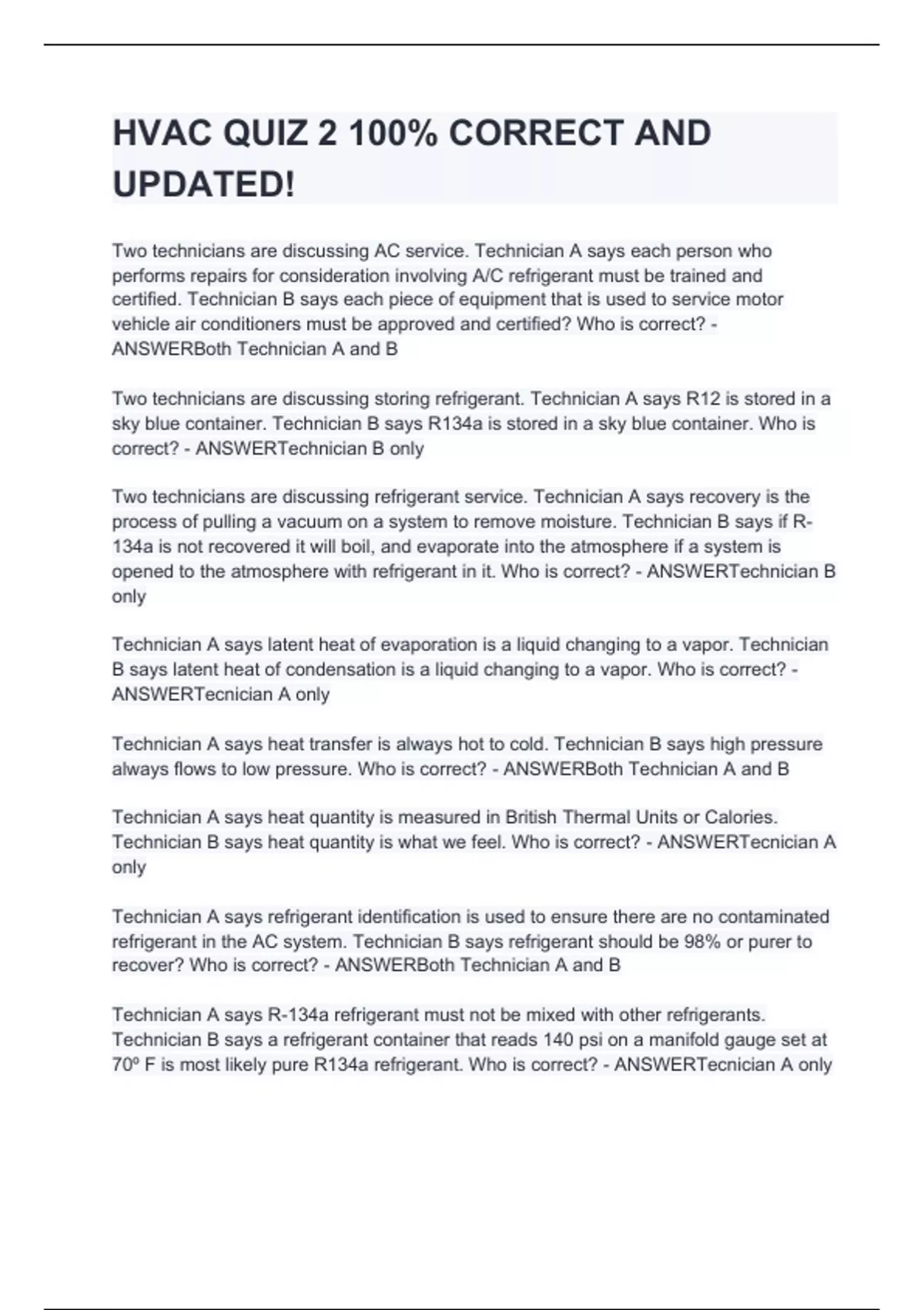Two technicians are discussing AC service. Technician A says each person who performs repairs for consideration involving A/C refrigerant must be trained and certified. Technician B says each piece of equipment that is used to service motor vehicle air conditioners must be approved and certified? Who is correct? - ANSWERBoth Technician A and B Two technicians are discussing storing refrigerant. Technician A says R12 is stored in a sky blue container. Technician B says R134a is stored in a sky blue container. Who is correct? - ANSWERTechnician B only Two technicians are discussing refrigerant service. Technician A says recovery is the process of pulling a vacuum on a system to remove moisture. Technician B says if R-134a is not recovered it will boil, and evaporate into the atmosphere if a system is opened to the atmosphere with refrigerant in it. Who is correct? - ANSWERTechnician B only Technician A says latent heat of evaporation is a liquid changing to a vapor. Technician B says latent heat of condensation is a liquid changing to a vapor. Who is correct? - ANSWERTecnician A only Technician A says heat transfer is always hot to cold. Technician B says high pressure always flows to low pressure. Who is correct? - ANSWERBoth Technician A and B Technician A says heat quantity is measured in British Thermal Units or Calories. Technician B says heat quantity is what we feel. Who is correct? - ANSW