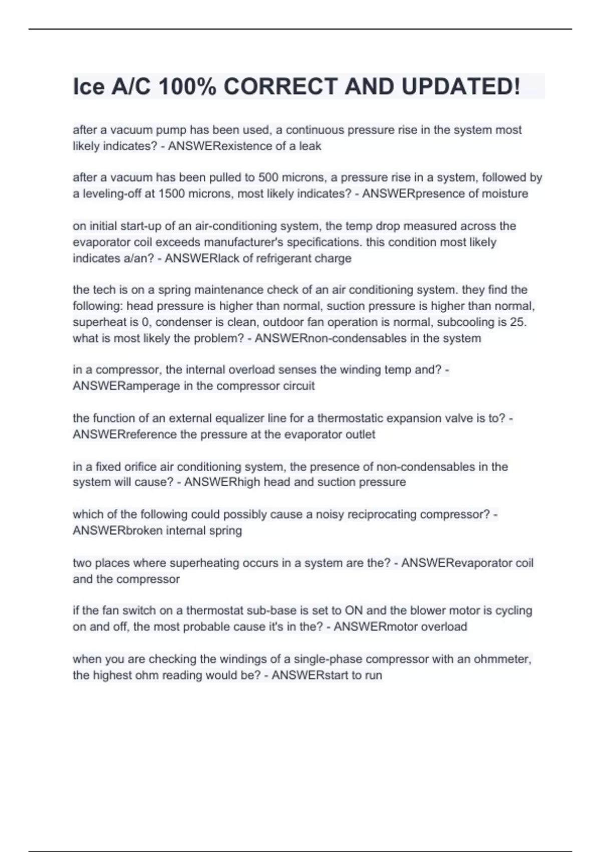 after a vacuum pump has been used, a continuous pressure rise in the system most likely indicates? - ANSWERexistence of a leak after a vacuum has been pulled to 500 microns, a pressure rise in a system, followed by a leveling-off at 1500 microns, most likely indicates? - ANSWERpresence of moisture on initial start-up of an air-conditioning system, the temp drop measured across the evaporator coil exceeds manufacturer's specifications. this condition most likely indicates a/an? - ANSWERlack of refrigerant charge the tech is on a spring maintenance check of an air conditioning system. they find the following: head pressure is higher than normal, suction pressure is higher than normal, superheat is 0, condenser is clean, outdoor fan operation is normal, subcooling is 25. what is most likely the problem? - ANSWERnon-condensables in the system in a compressor, the internal overload senses the winding temp and? - ANSWERamperage in the compressor circuit the function of an external equalizer line for a thermostatic expansion valve is to? - ANSWERreference the pressure at the evaporator outlet in a fixed orifice air conditioning system, the presence of non-condensables in the system will cause? - ANSWERhigh head and suction pressure which of the following could possibly cause a noisy reciprocating compressor? - ANSWERbroken internal spring