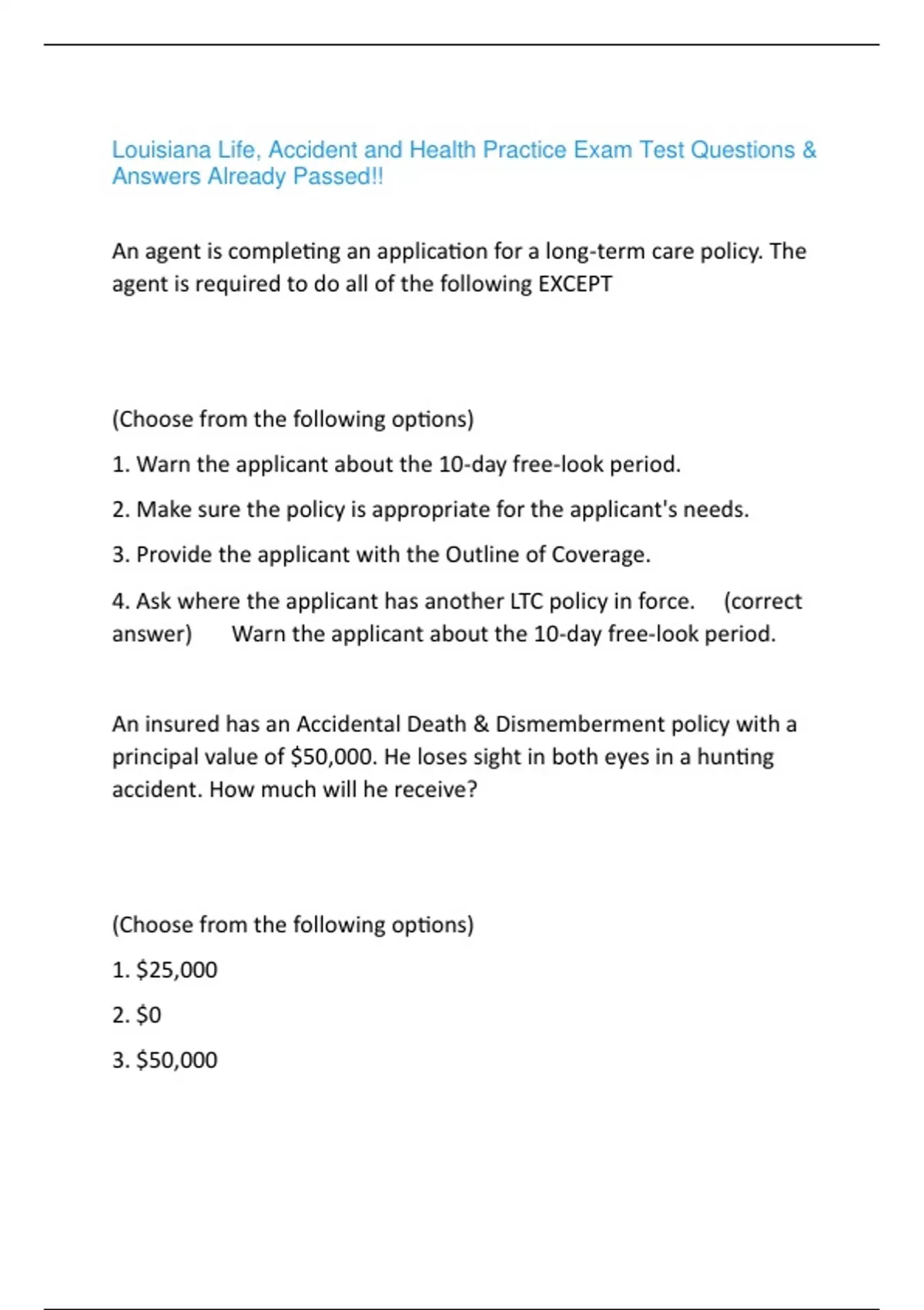 Louisiana Life, Accident and Health Practice Exam Test Questions & Answers Already Passed!!