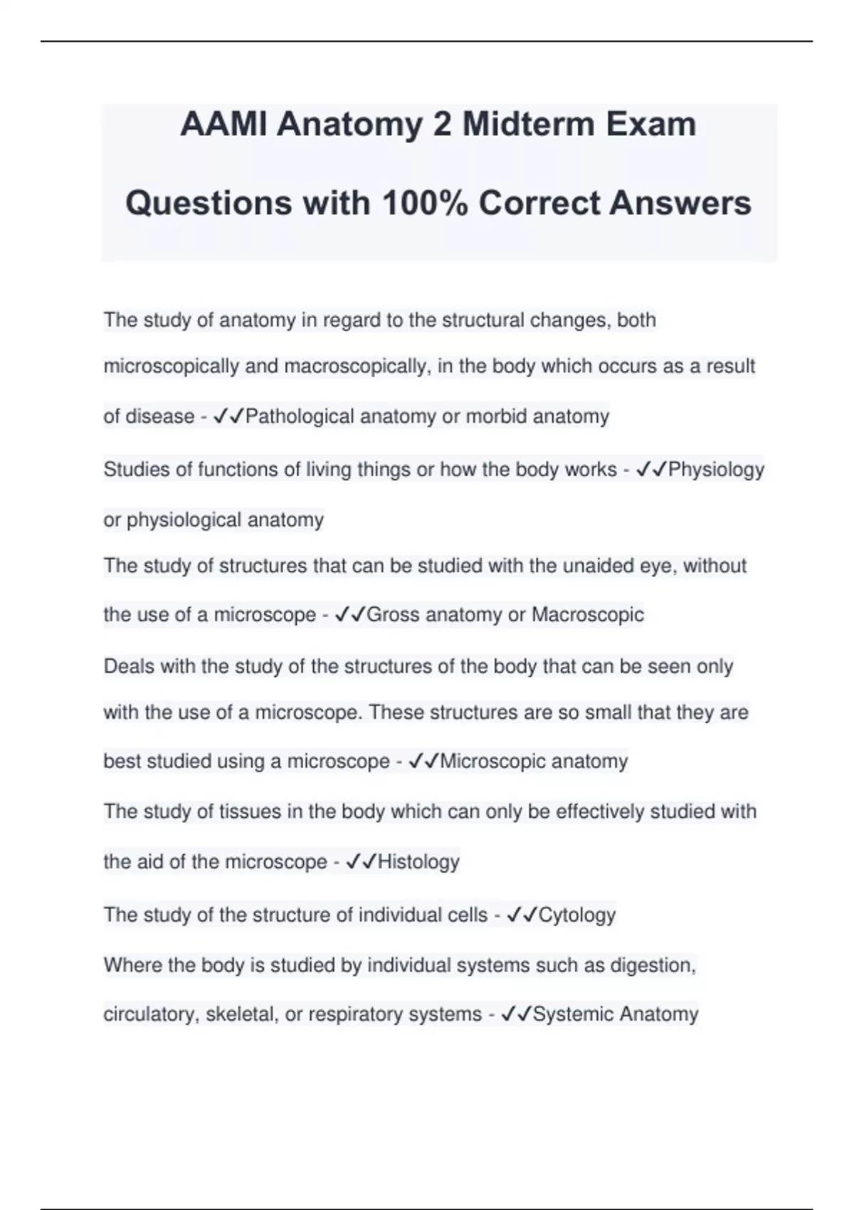 AAMI Anatomy 2 Midterm Exam Questions with 100% Correct Answers The study of anatomy in regard to the structural changes, both microscopically and macroscopically, in the body which occurs as a result of disease - Pathological anatomy or morbid anatomy Studies of functions of living things or how the body works - Physiology or physiological anatomy The study of structures that can be studied with the unaided eye, without the use of a microscope - Gross anatomy or Macroscopic Deals with the study of the structures of the body that can be seen only with the use of a microscope. These structures are so small that they are best studied using a microscope - Microscopic anatomy The study of tissues in the body which can only be effectively studied with the aid of the microscope - Histology The study of the structure of individual cells - Cytology Where the body is studied by individual systems such as digestion, circulatory, skeletal, or respiratory systems - Systemic Anatomy
