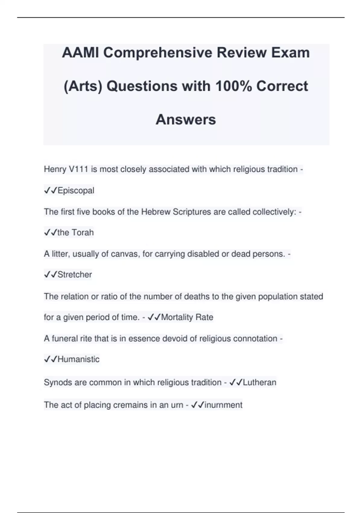 AAMI Comprehensive Review Exam (Arts) Questions with 100% Correct Answers Henry V111 is most closely associated with which religious tradition - Episcopal The first five books of the Hebrew Scriptures are called collectively: - the Torah A litter, usually of canvas, for carrying disabled or dead persons. - Stretcher The relation or ratio of the number of deaths to the given population stated for a given period of time. - Mortality Rate A funeral rite that is in essence devoid of religious connotation - Humanistic Synods are common in which religious tradition - Lutheran The act of placing cremains in an urn - inurnment