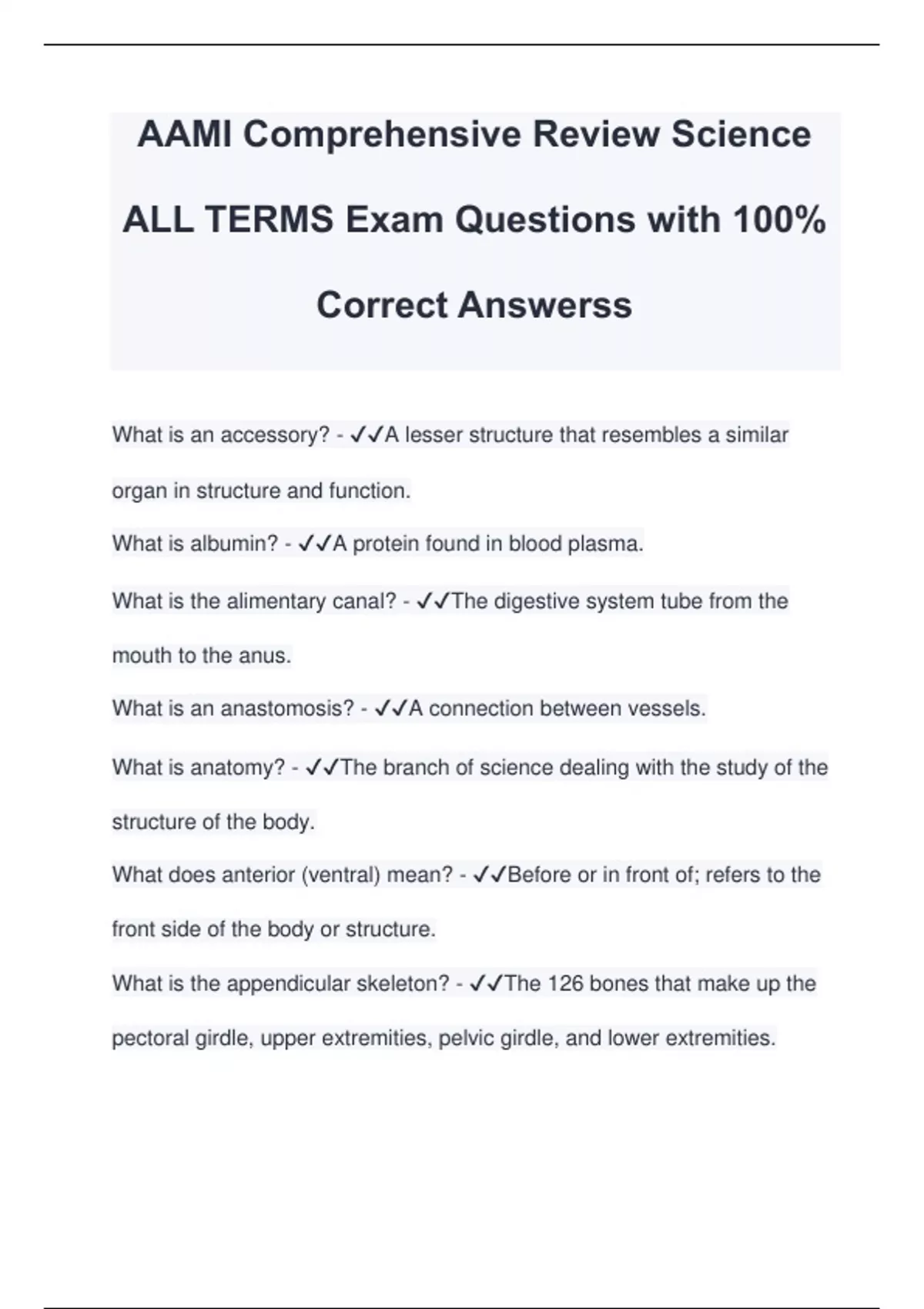 AAMI Comprehensive Review Science ALL TERMS Exam Questions with 100% Correct Answerss What is an accessory? - A lesser structure that resembles a similar organ in structure and function. What is albumin? - A protein found in blood plasma. What is the alimentary canal? - The digestive system tube from the mouth to the anus. What is an anastomosis? - A connection between vessels. What is anatomy? - The branch of science dealing with the study of the structure of the body. What does anterior (ventral) mean? - Before or in front of; refers to the front side of the body or structure. What is the appendicular skeleton? - The 126 bones that make up the pectoral girdle, upper extremities, pelvic girdle, and lower extremities
