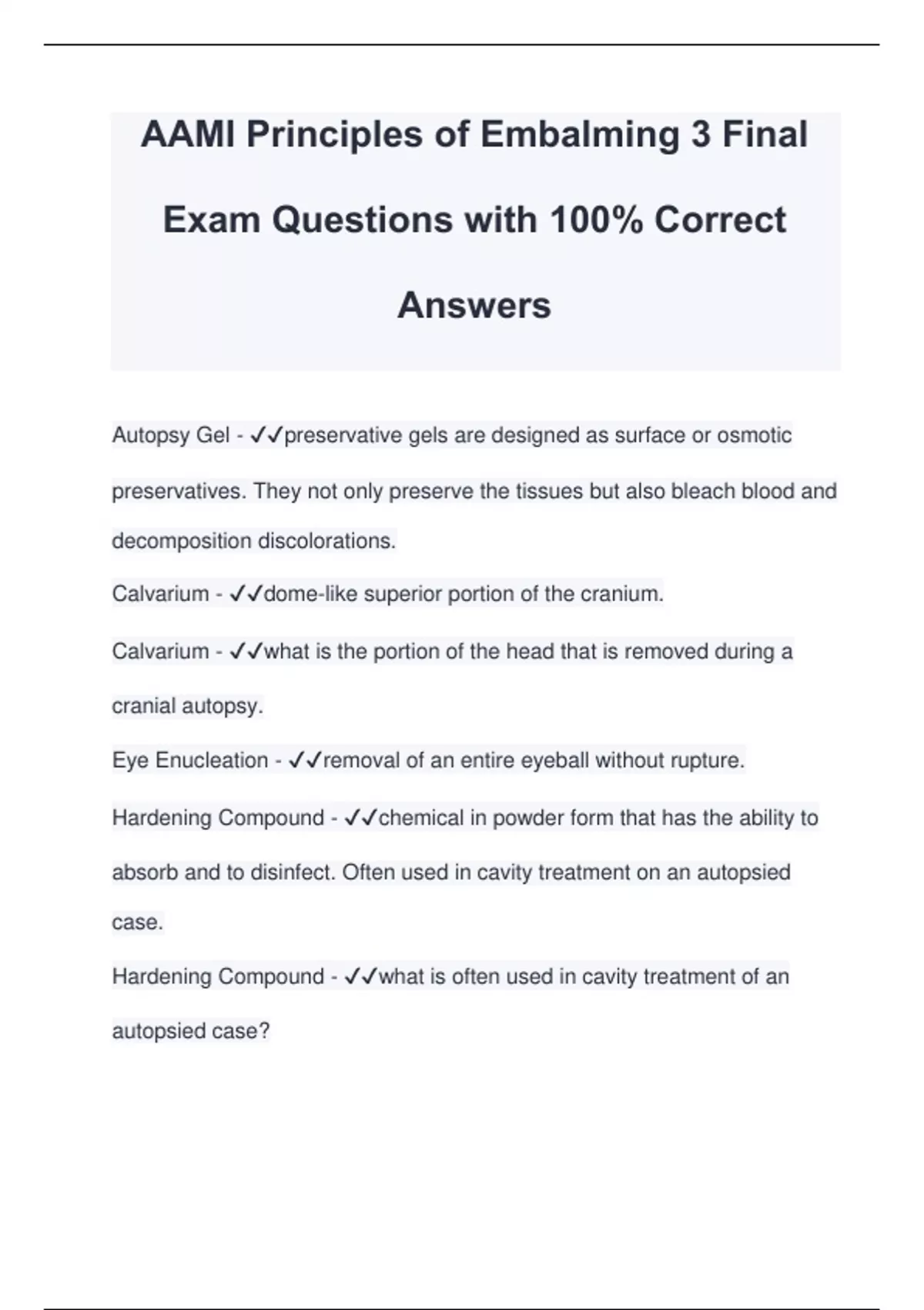 AAMI Principles of Embalming 3 Final Exam Questions with 100% Correct Answers Autopsy Gel - preservative gels are designed as surface or osmotic preservatives. They not only preserve the tissues but also bleach blood and decomposition discolorations. Calvarium - dome-like superior portion of the cranium. Calvarium - what is the portion of the head that is removed during a cranial autopsy. Eye Enucleation - removal of an entire eyeball without rupture. Hardening Compound - chemical in powder form that has the ability to absorb and to disinfect. Often used in cavity treatment on an autopsied case. Hardening Compound - what is often used in cavity treatment of an autopsied case?