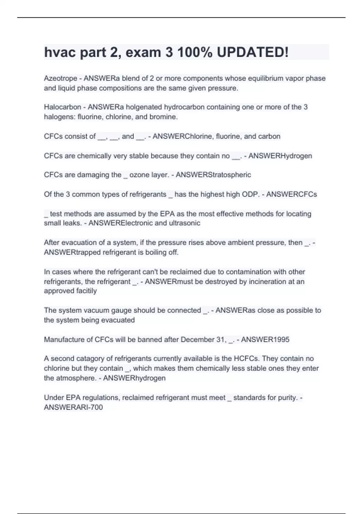 Azeotrope - ANSWERa blend of 2 or more components whose equilibrium vapor phase and liquid phase compositions are the same given pressure. Halocarbon - ANSWERa holgenated hydrocarbon containing one or more of the 3 halogens: fluorine, chlorine, and bromine. CFCs consist of __, __, and __. - ANSWERChlorine, fluorine, and carbon CFCs are chemically very stable because they contain no __. - ANSWERHydrogen CFCs are damaging the _ ozone layer. - ANSWERStratospheric Of the 3 common types of refrigerants _ has the highest high ODP. - ANSWERCFCs _ test methods are assumed by the EPA as the most effective methods for locating small leaks. - ANSWERElectronic and ultrasonic After evacuation of a system, if the pressure rises above ambient pressure, then _. - ANSWERtrapped refrigerant is boiling off. In cases where the refrigerant can't be reclaimed due to contamination with other refrigerants, the refrigerant _. - ANSWERmust be destroyed by incineration at an approved facitily The system vacuum gauge should be connected _. - ANSWERas close as possible to the system being evacuated Manufacture of CFCs will be banned after December 31, _. - ANSWER1995 A second catagory of refrigerants currently available is the HCFCs. They contain no chlorine but they contain _, which makes them chemically less stable ones they enter the atmosphere. - ANSWERhydrogen