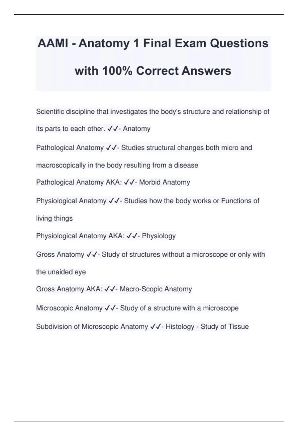 AAMI - Anatomy 1 Final Exam Questions with 100% Correct Answers Scientific discipline that investigates the body's structure and relationship of its parts to each other. - Anatomy Pathological Anatomy - Studies structural changes both micro and macroscopically in the body resulting from a disease Pathological Anatomy AKA: - Morbid Anatomy Physiological Anatomy - Studies how the body works or Functions of living things Physiological Anatomy AKA: - Physiology Gross Anatomy - Study of structures without a microscope or only with the unaided eye Gross Anatomy AKA: - Macro-Scopic Anatomy Microscopic Anatomy - Study of a structure with a microscope Subdivision of Microscopic Anatomy - Histology - Study of Tissue