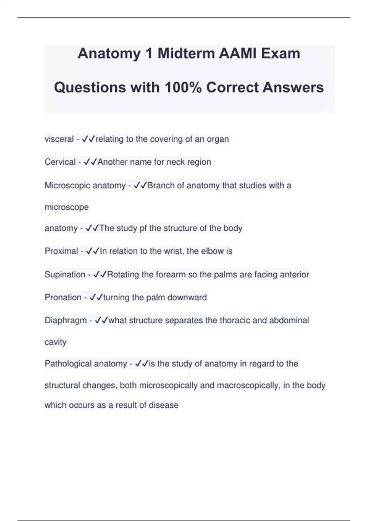 Anatomy 1 Midterm AAMI Exam Questions with 100% Correct Answers visceral - relating to the covering of an organ Cervical - Another name for neck region Microscopic anatomy - Branch of anatomy that studies with a microscope anatomy - The study pf the structure of the body Proximal - In relation to the wrist, the elbow is Supination - Rotating the forearm so the palms are facing anterior Pronation - turning the palm downward Diaphragm - what structure separates the thoracic and abdominal cavity Pathological anatomy - is the study of anatomy in regard to the structural changes, both microscopically and macroscopically, in the body which occurs as a result of disease