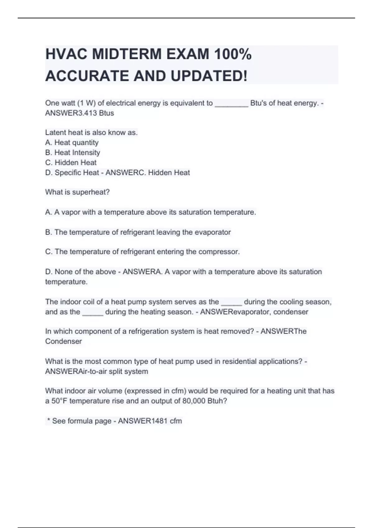 One watt (1 W) of electrical energy is equivalent to ________ Btu's of heat energy. - ANSWER3.413 Btus Latent heat is also know as. A. Heat quantity B. Heat Intensity C. Hidden Heat D. Specific Heat - ANSWERC. Hidden Heat What is superheat? A. A vapor with a temperature above its saturation temperature. B. The temperature of refrigerant leaving the evaporator C. The temperature of refrigerant entering the compressor. D. None of the above - ANSWERA. A vapor with a temperature above its saturation temperature. The indoor coil of a heat pump system serves as the _____ during the cooling season, and as the _____ during the heating season. - ANSWERevaporator, condenser In which component of a refrigeration system is heat removed? - ANSWERThe Condenser What is the most common type of heat pump used in residential applications? - ANSWERAir-to-air split system What indoor air volume (expressed in cfm) would be required for a heating unit that has a 50°F temperature rise and an output of 80,000 Btuh? * See formula page - ANSWER1481 cfm