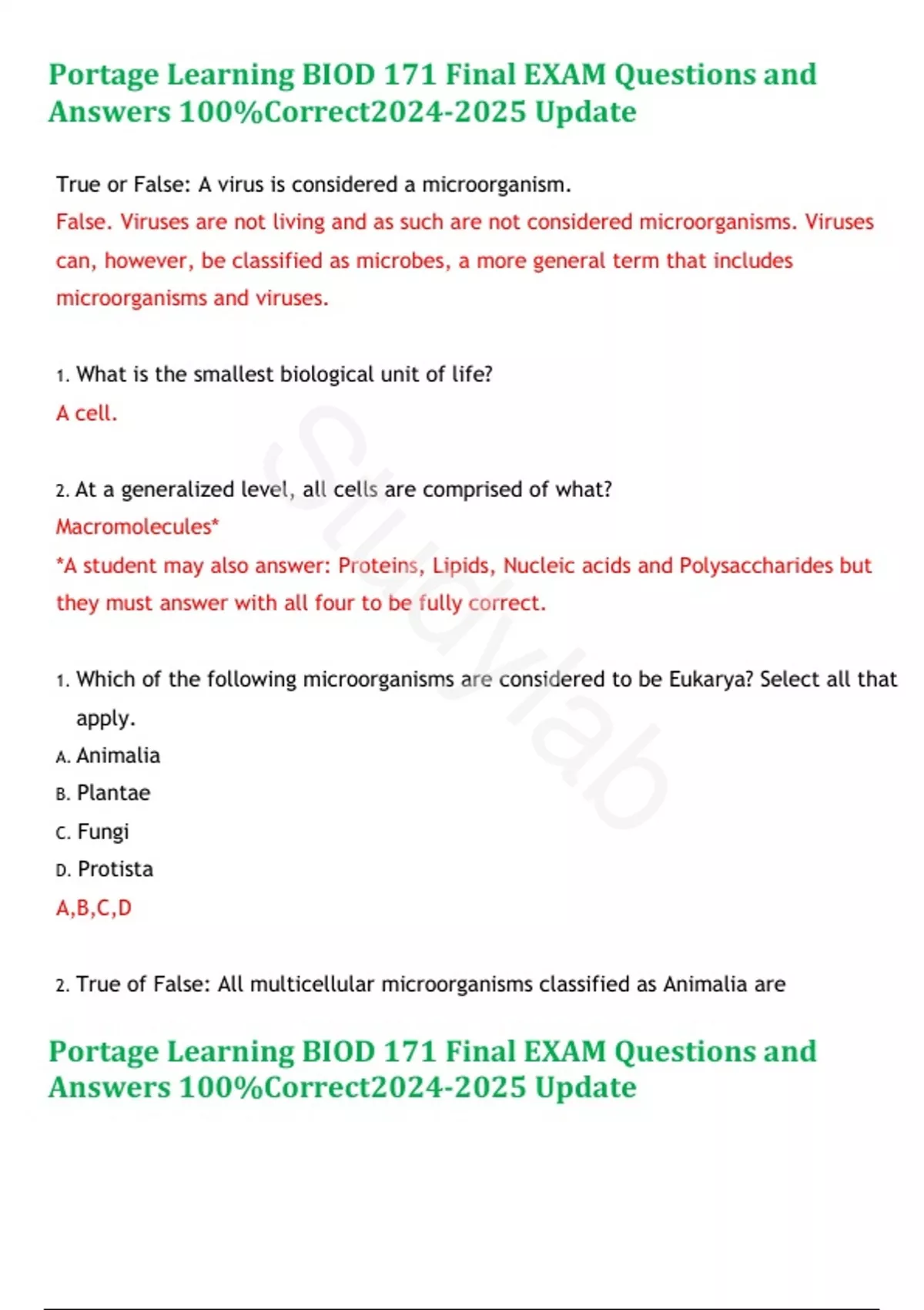Portage Learning BIOD 171 Final EXAM Questions and Answers 100%Correct Update