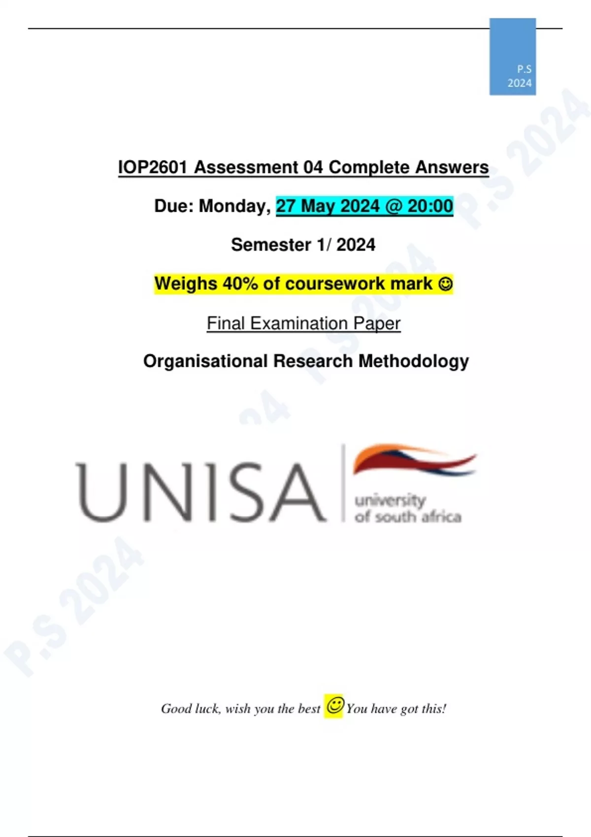 IOP2601 Assignment 4 (COMPLETE ANSWERS) Semester 1 2024 - [DUE: 27 MAY 2024 @20:00]. 100% TRUSTED & QUALITY SOLUTIONS. It includes detailed answers, guidelines and calculations. The answers also include references to pages in the textbook and study guide. Feel free to DM or email for any questions, assistance and elaborations. QUESTION 1 [10] (a) What is research, and why is it important? (2) (b) How does research differ from common misconceptions? (2)