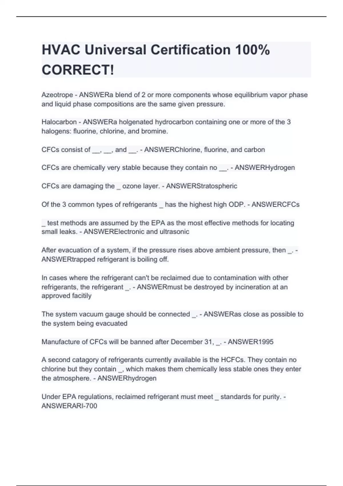 Azeotrope - ANSWERa blend of 2 or more components whose equilibrium vapor phase and liquid phase compositions are the same given pressure. Halocarbon - ANSWERa holgenated hydrocarbon containing one or more of the 3 halogens: fluorine, chlorine, and bromine. CFCs consist of __, __, and __. - ANSWERChlorine, fluorine, and carbon CFCs are chemically very stable because they contain no __. - ANSWERHydrogen CFCs are damaging the _ ozone layer. - ANSWERStratospheric Of the 3 common types of refrigerants _ has the highest high ODP. - ANSWERCFCs _ test methods are assumed by the EPA as the most effective methods for locating small leaks. - ANSWERElectronic and ultrasonic After evacuation of a system, if the pressure rises above ambient pressure, then _. - ANSWERtrapped refrigerant is boiling off.