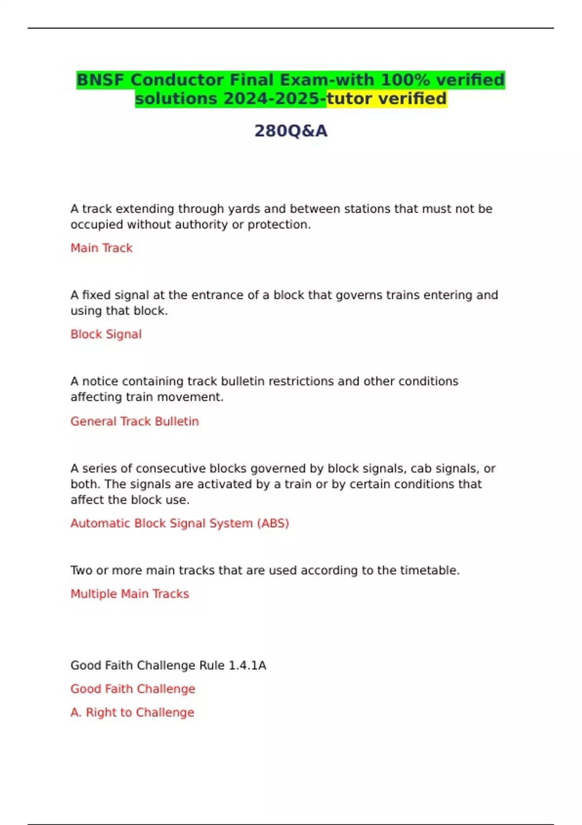 BNSF Conductor Final Exam-with 100% verified solutions -tutor verified