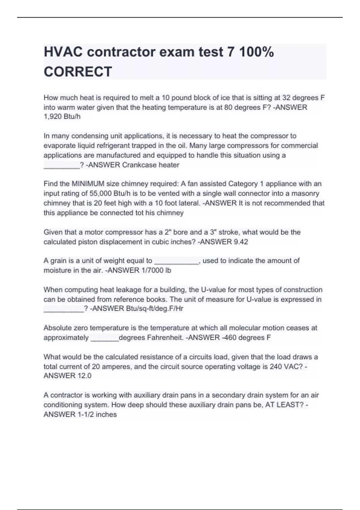 How much heat is required to melt a 10 pound block of ice that is sitting at 32 degrees F into warm water given that the heating temperature is at 80 degrees F? -ANSWER 1,920 Btu/h In many condensing unit applications, it is necessary to heat the compressor to evaporate liquid refrigerant trapped in the oil. Many large compressors for commercial applications are manufactured and equipped to handle this situation using a _________? -ANSWER Crankcase heater Find the MINIMUM size chimney required: A fan assisted Category 1 appliance with an input rating of 55,000 Btu/h is to be vented with a single wall connector into a masonry chimney that is 20 feet high with a 10 foot lateral. -ANSWER It is not recommended that this appliance be connected tot his chimney Given that a motor compressor has a 2" bore and a 3" stroke, what would be the calculated piston displacement in cubic inches? -ANSWER 9.42 A grain is a unit of weight equal to ___________, used to indicate the amount of moisture in the air. -ANSWER 1/7000 lb When computing heat leakage for a building, the U-value for most types of construction can be obtained from reference books. The unit of measure for U-value is expressed in __________? -ANSWER Btu/sq-ft/deg.F/Hr