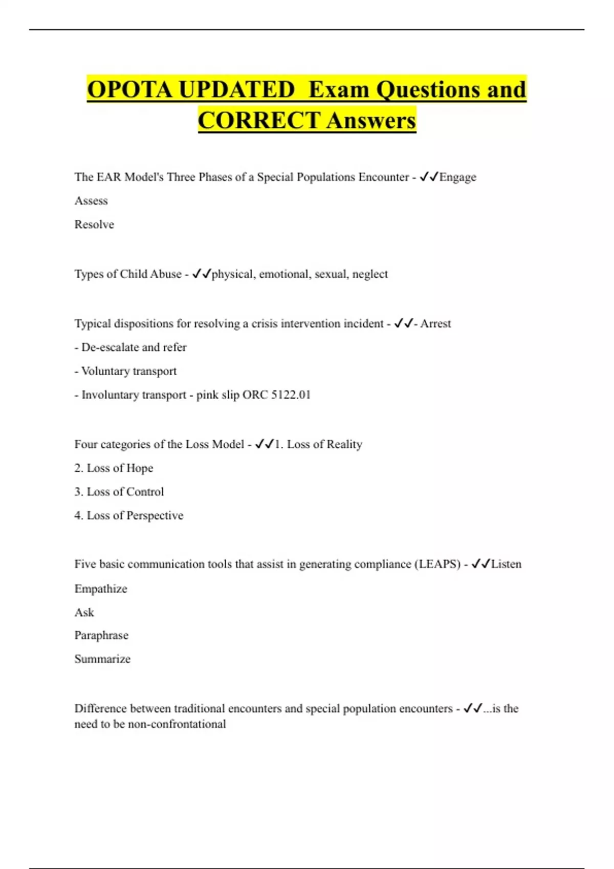 The EAR Model's Three Phases of a Special Populations Encounter - Engage Assess Resolve Types of Child Abuse - physical, emotional, sexual, neglect Typical dispositions for resolving a crisis intervention incident - - Arrest - De-escalate and refer - Voluntary transport - Involuntary transport - pink slip ORC 5122.01 Four categories of the Loss Model - 1. Loss of Reality 2. Loss of Hope 3. Loss of Control 4. Loss of Perspective