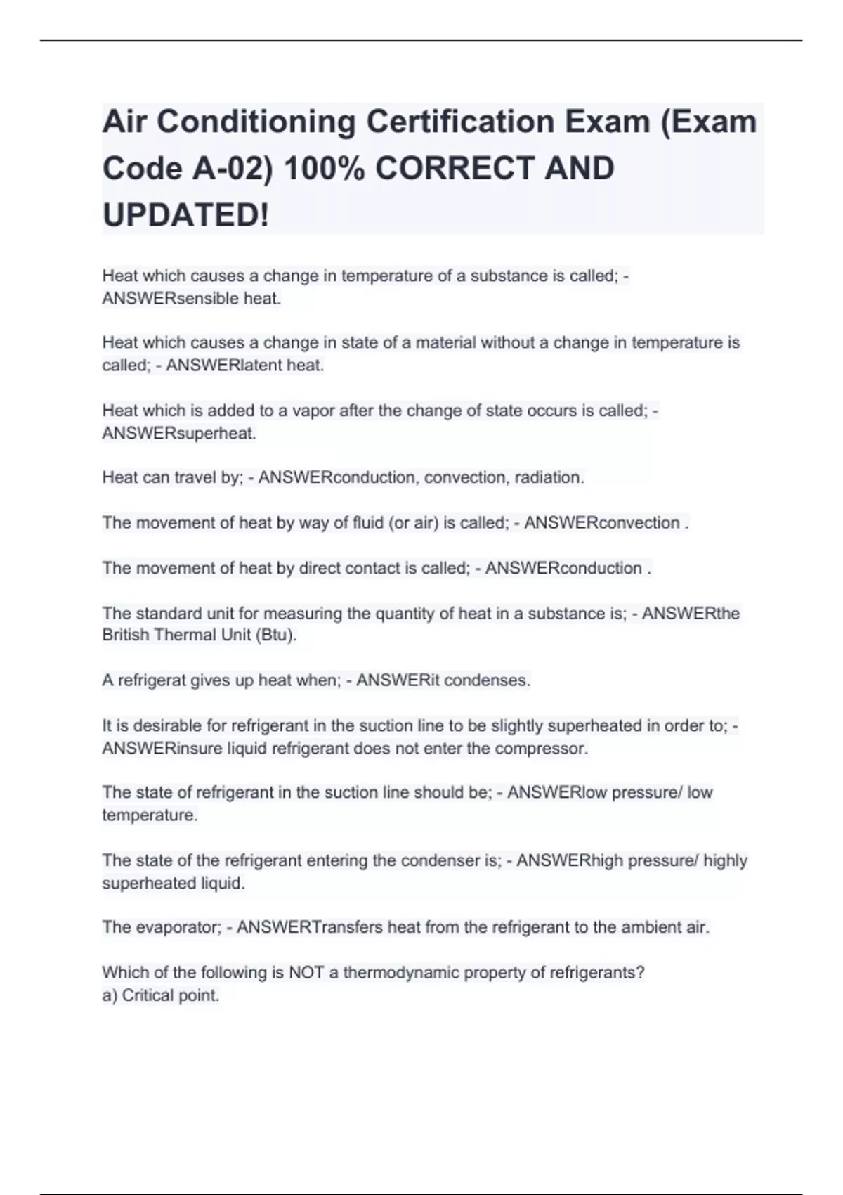 Air Conditioning Certification Exam (Exam Code A-02) 100% CORRECT AND UPDATED!