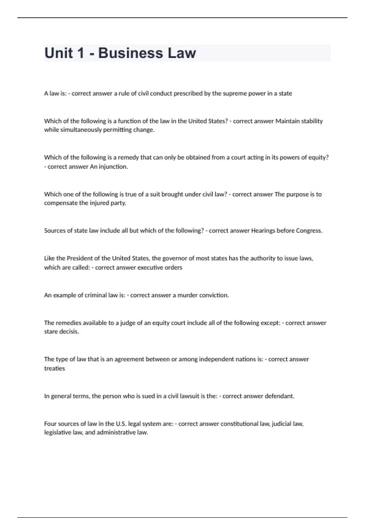 business law Collin College -Unit 1 - Business Law correctly answeredA law is: - correct answer a rule of civil conduct prescribed by the supreme power in a state Which of the following is a function of the law in the United States? - correct answer Maintain stability while simultaneously permitting change. Which of the following is a remedy that can only be obtained from a court acting in its powers of equity? - correct answer An injunction. Which one of the following is true of a suit brought under civil law? - correct answer The purpose is to compensate the injured party. Sources of state law include all but which of the following? - correct answer Hearings before Congress. Like the President of the United States, the governor of most states has the authority to issue laws, which are called: - correct answer executive orders An example of criminal law is: - correct answer a murder conviction. The remedies available to a judge of an equity court include all of the following except: - correct answer stare decisis. The type of law that is an agreement between or among independent nations is: - correct answer treaties In general terms, the person who is sued in a civil lawsuit is the: - correct answer defendant. Four sources of law in the U.S. legal system are: - correct answer constitutional law, judicial law, legislative law, and administrative law. The party who appeals a case to a higher court is the: - correct answer appellant. A decision of one of the U.S. District courts would be recorded in the: - correct answer Federal Supplement. Stuart has been charged with burglary of an apartment building. The prosecutor must prove Stuart's guilt: - correct answer beyond a reasonable doubt. Alexandra has been sued Wendy for failure to pay rent for their apartment. Which body of law will govern the lawsuit? - correct answer Civil law. The Constitution of the United States puts into place which central principle of our government? - correct answer Separation of powers. Andrew purchased an original oil painting, but the painter refused to deliver the work of art. If he seeks to get an order to have the painting delivered. He will request an order for: - correct answer specific performance. A new state law, passed by the legislature, mandates that all employers must prohibit employee texting in employer vehicles. The law further provides that any employer who allows an employee to text in its vehicles is subject to a court order requiring the employer to enforce the law. This law is a matter of: - correct answer substantive law. If the State of Michigan passed laws that regulate the ensuring of free and impartial municipal elections, which essential function of the law do these laws serve? - correct answer Preservation of the state Next month, Mexico seeks to enter into a treaty with the State of Texas over water rights involving the Rio Grande. Is this treaty constitutional under the U.S. Constitution? - correct answer No, a treaty is an agreement among independent nations and Texas is not an independent nation. Dylan believes that his neighbor, Nancy, is improperly erecting a fence on Dylan's property. Despite efforts to get Nancy to stop the construction of the fence, she refuses. Dylan then sues Nancy and seeks