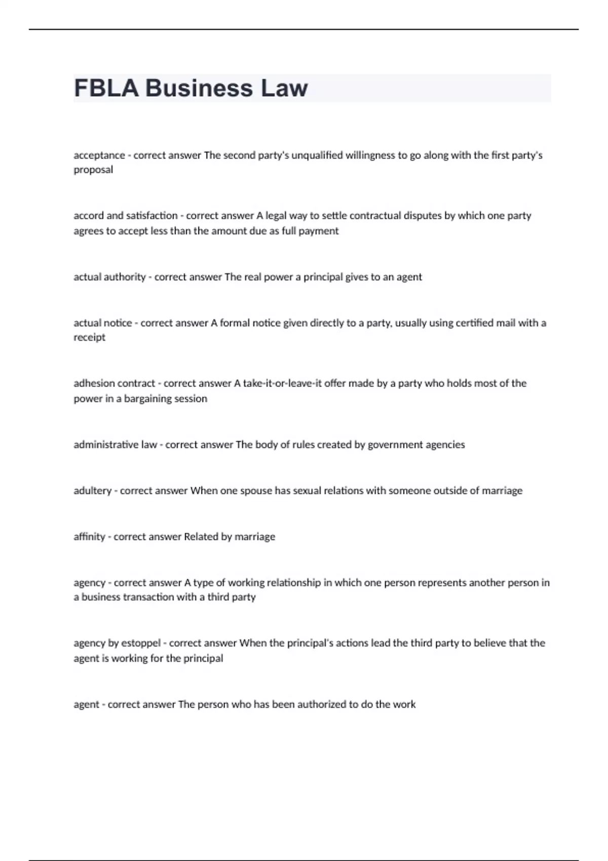 business law Collin College -FBLA Business Law questions n answers acceptance - correct answer The second party's unqualified willingness to go along with the first party's proposal accord and satisfaction - correct answer A legal way to settle contractual disputes by which one party agrees to accept less than the amount due as full payment actual authority - correct answer The real power a principal gives to an agent actual notice - correct answer A formal notice given directly to a party, usually using certified mail with a receipt adhesion contract - correct answer A take-it-or-leave-it offer made by a party who holds most of the power in a bargaining session administrative law - correct answer The body of rules created by government agencies adultery - correct answer When one spouse has sexual relations with someone outside of marriage affinity - correct answer Related by marriage agency - correct answer A type of working relationship in which one person represents another person in a business transaction with a third party agency by estoppel - correct answer When the principal's actions lead the third party to believe that the agent is working for the principal agent - correct answer The person who has been authorized to do the work