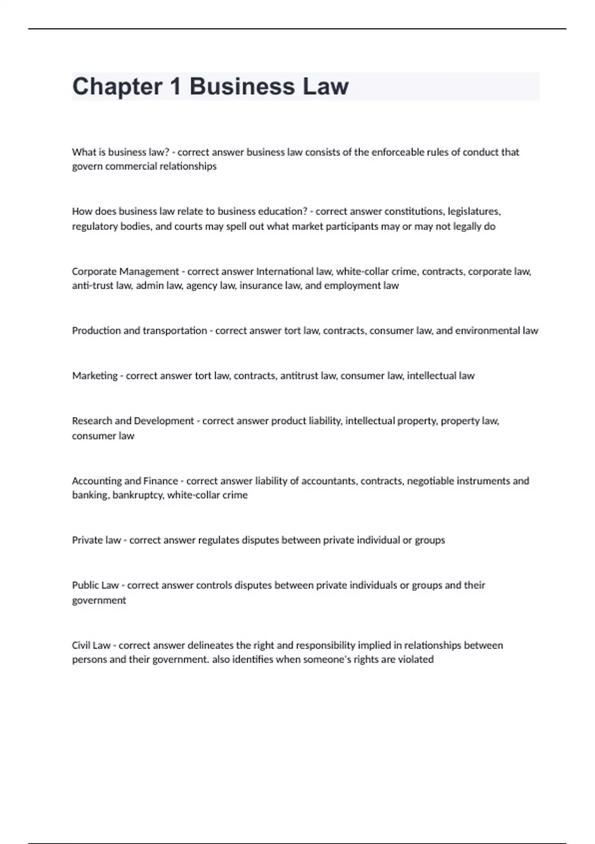 Chapter 1 Business Law questions well answered graded A+What is business law? - correct answer business law consists of the enforceable rules of conduct that govern commercial relationships How does business law relate to business education? - correct answer constitutions, legislatures, regulatory bodies, and courts may spell out what market participants may or may not legally do Corporate Management - correct answer International law, white-collar crime, contracts, corporate law, anti-trust law, admin law, agency law, insurance law, and employment law Production and transportation - correct answer tort law, contracts, consumer law, and environmental law Marketing - correct answer tort law, contracts, antitrust law, consumer law, intellectual law Research and Development - correct answer product liability, intellectual property, property law, consumer law Accounting and Finance - correct answer liability of accountants, contracts, negotiable instruments and banking, bankruptcy, white-collar crime Private law - correct answer regulates disputes between private individual or groups Public Law - correct answer controls disputes between private individuals or groups and their government Civil Law - correct answer delineates the right and responsibility implied in relationships between persons and their government. also identifies when someone's rights are violated
