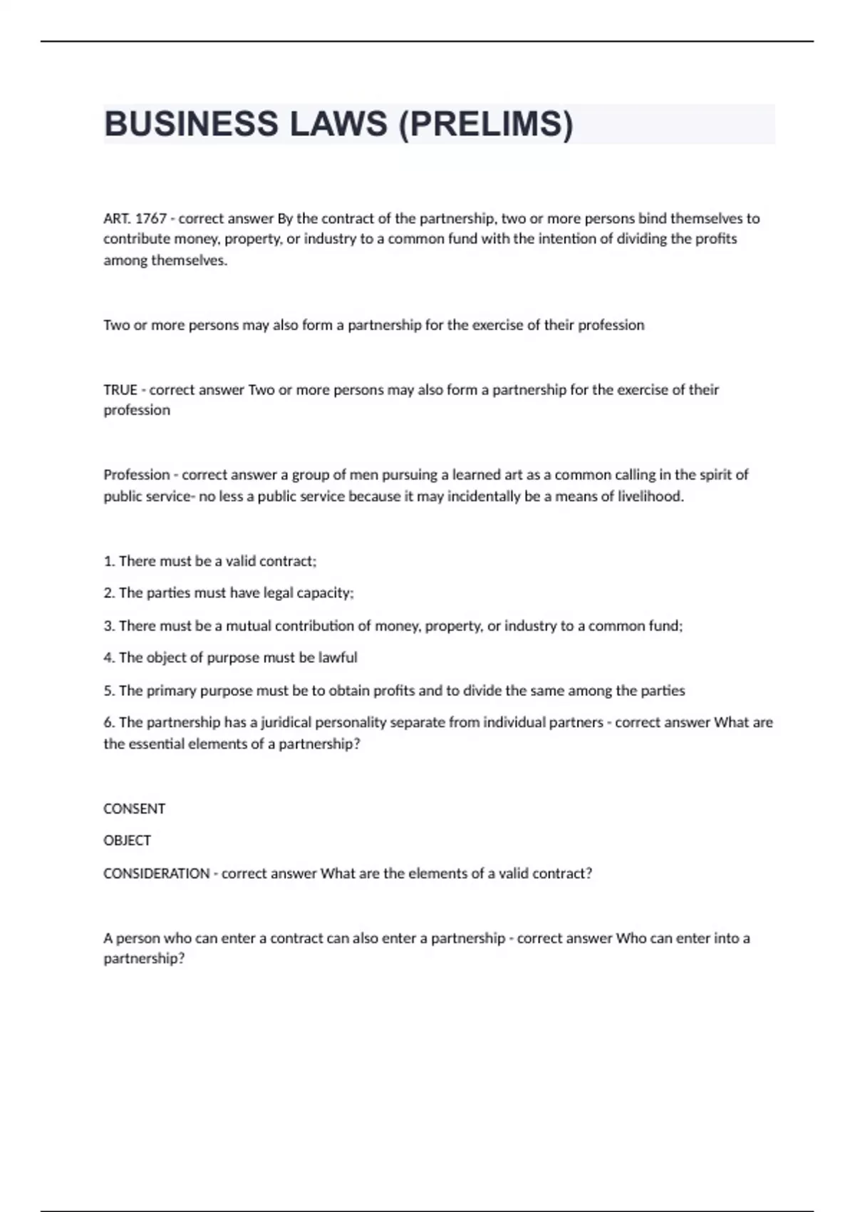 business law Collin College -BUSINESS LAWS (PRELIMS) correctly answered rated A+ART. 1767 - correct answer By the contract of the partnership, two or more persons bind themselves to contribute money, property, or industry to a common fund with the intention of dividing the profits among themselves. Two or more persons may also form a partnership for the exercise of their profession TRUE - correct answer Two or more persons may also form a partnership for the exercise of their profession Profession - correct answer a group of men pursuing a learned art as a common calling in the spirit of public service- no less a public service because it may incidentally be a means of livelihood. 1. There must be a valid contract; 2. The parties must have legal capacity; 3. There must be a mutual contribution of money, property, or industry to a common fund; 4. The object of purpose must be lawful 5. The primary purpose must be to obtain profits and to divide the same among the parties 6. The partnership has a juridical personality separate from individual partners - correct answer What are the essential elements of a partnership? CONSENT OBJECT CONSIDERATION - correct answer What are the elements of a valid contract? A person who can enter a contract can also enter a partnership - correct answer Who can enter into a partnership?