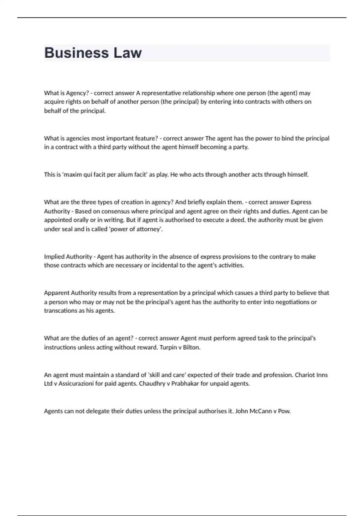 business law Collin College -Business Law fully solvedWhat is Agency? - correct answer A representative relationship where one person (the agent) may acquire rights on behalf of another person (the principal) by entering into contracts with others on behalf of the principal. What is agencies most important feature? - correct answer The agent has the power to bind the principal in a contract with a third party without the agent himself becoming a party. This is 'maxim qui facit per alium facit' as play. He who acts through another acts through himself. What are the three types of creation in agency? And briefly explain them. - correct answer Express Authority - Based on consensus where principal and agent agree on their rights and duties. Agent can be appointed orally or in writing. But if agent is authorised to execute a deed, the authority must be given under seal and is called 'power of attorney'. Implied Authority - Agent has authority in the absence of express provisions to the contrary to make those contracts which are necessary or incidental to the agent's activities. Apparent Authority results from a representation by a principal which casues a third party to believe that a person who may or may not be the principal's agent has the authority to enter into negotiations or transcations as his agents. What are the duties of an agent? - correct answer Agent must perform agreed task to the principal's instructions unless acting without reward. Turpin v Bilton. An agent must maintain a standard of 'skill and care' expected of their trade and profession. Chariot Inns Ltd v Assicurazioni for paid agents. Chaudhry v Prabhakar for unpaid agents.
