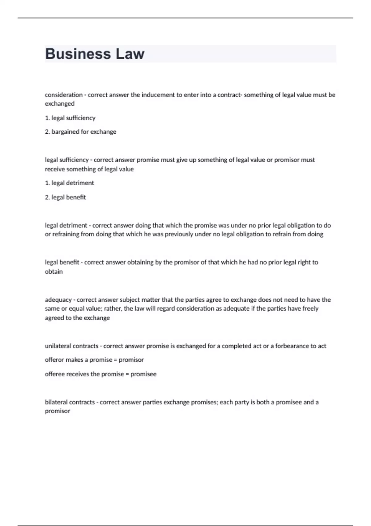 business law Collin College -Business Law with answers rated A+consideration - correct answer the inducement to enter into a contract- something of legal value must be exchanged 1. legal sufficiency 2. bargained for exchange legal sufficiency - correct answer promise must give up something of legal value or promisor must receive something of legal value 1. legal detriment 2. legal benefit legal detriment - correct answer doing that which the promise was under no prior legal obligation to do or refraining from doing that which he was previously under no legal obligation to refrain from doing legal benefit - correct answer obtaining by the promisor of that which he had no prior legal right to obtain adequacy - correct answer subject matter that the parties agree to exchange does not need to have the same or equal value; rather, the law will regard consideration as adequate if the parties have freely agreed to the exchange unilateral contracts - correct answer promise is exchanged for a completed act or a forbearance to act offeror makes a promise = promisor offeree receives the promise = promisee bilateral contracts - correct answer parties exchange promises; each party is both a promisee and a promisor
