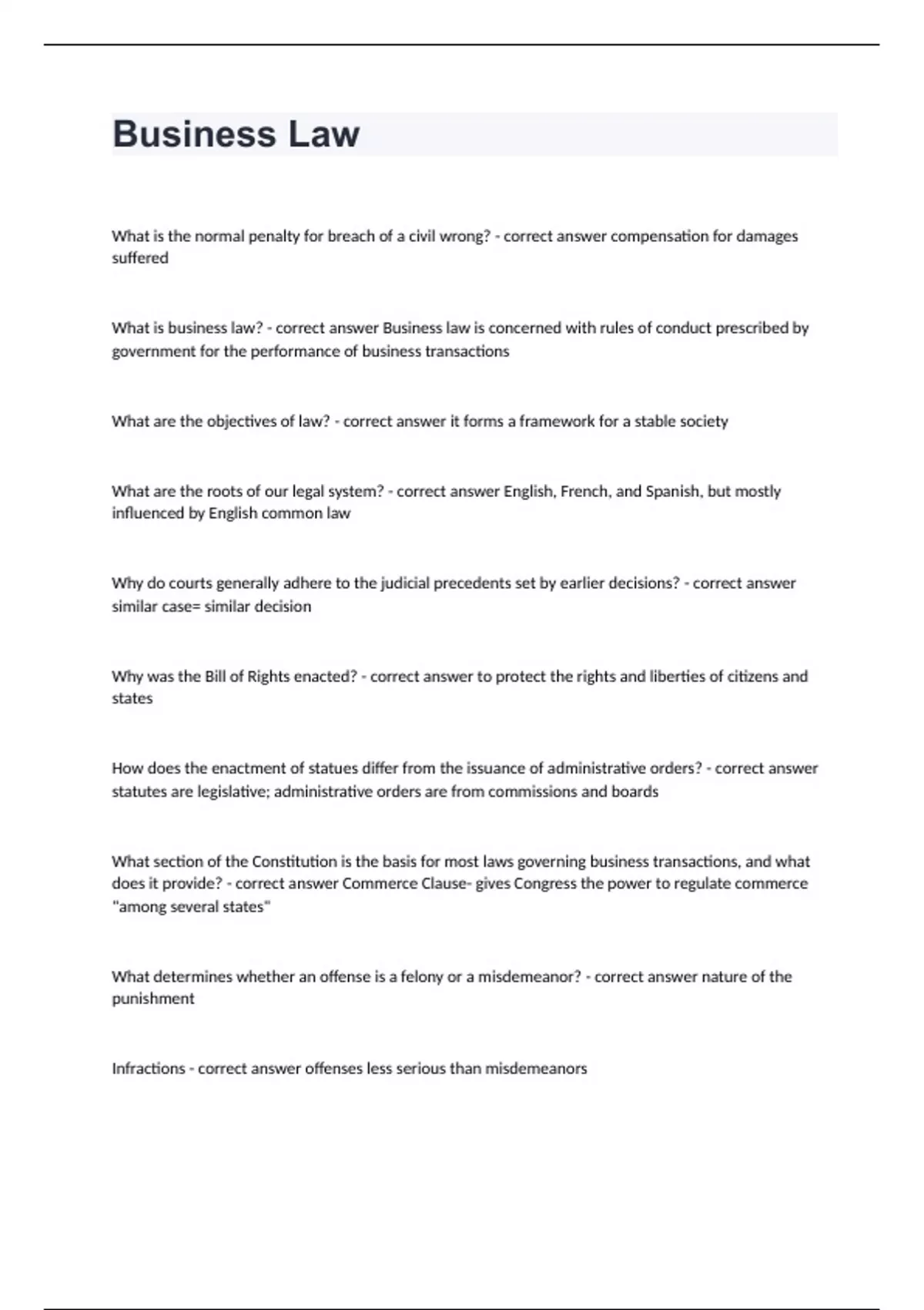 business law Collin College -Business Law correctly answeredWhat is the normal penalty for breach of a civil wrong? - correct answer compensation for damages suffered What is business law? - correct answer Business law is concerned with rules of conduct prescribed by government for the performance of business transactions What are the objectives of law? - correct answer it forms a framework for a stable society What are the roots of our legal system? - correct answer English, French, and Spanish, but mostly influenced by English common law Why do courts generally adhere to the judicial precedents set by earlier decisions? - correct answer similar case= similar decision Why was the Bill of Rights enacted? - correct answer to protect the rights and liberties of citizens and states How does the enactment of statues differ from the issuance of administrative orders? - correct answer statutes are legislative; administrative orders are from commissions and boards What section of the Constitution is the basis for most laws governing business transactions, and what does it provide? - correct answer Commerce Clause- gives Congress the power to regulate commerce "among several states" What determines whether an offense is a felony or a misdemeanor? - correct answer nature of the punishment
