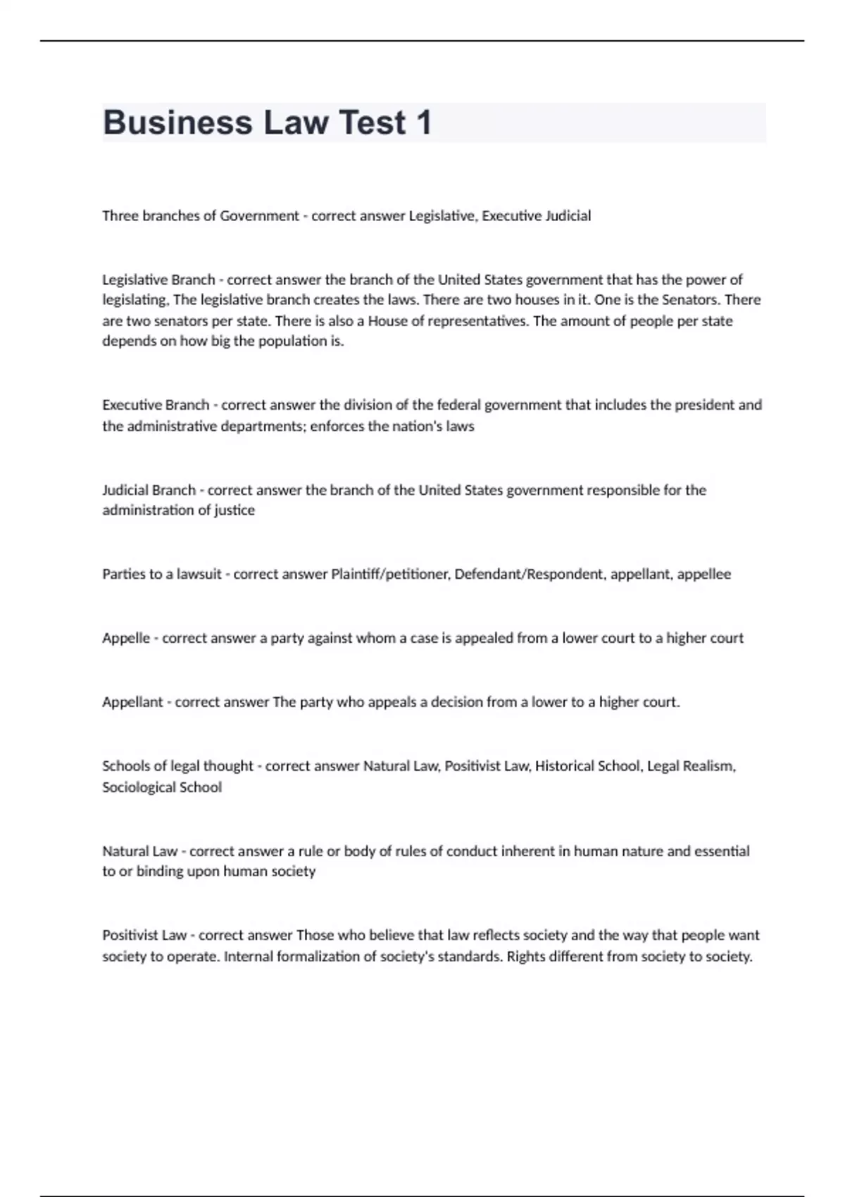 business law Collin College -Business Law Test 1 well answered rated A+Three branches of Government - correct answer Legislative, Executive Judicial Legislative Branch - correct answer the branch of the United States government that has the power of legislating, The legislative branch creates the laws. There are two houses in it. One is the Senators. There are two senators per state. There is also a House of representatives. The amount of people per state depends on how big the population is. Executive Branch - correct answer the division of the federal government that includes the president and the administrative departments; enforces the nation's laws Judicial Branch - correct answer the branch of the United States government responsible for the administration of justice Parties to a lawsuit - correct answer Plaintiff/petitioner, Defendant/Respondent, appellant, appellee Appelle - correct answer a party against whom a case is appealed from a lower court to a higher court Appellant - correct answer The party who appeals a decision from a lower to a higher court. Schools of legal thought - correct answer Natural Law, Positivist Law, Historical School, Legal Realism, Sociological School Natural Law - correct answer a rule or body of rules of conduct inherent in human nature and essential to or binding upon human society Positivist Law - correct answer Those who believe that law reflects society and the way that people want society to operate. Internal formalization of society's standards. Rights different from society to society.