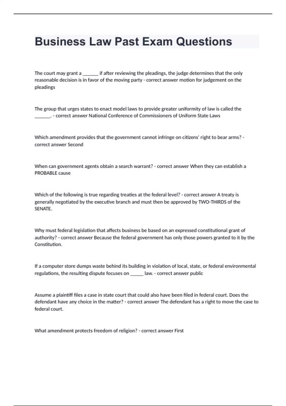 business law Collin College -Business Law Past Exam Questions correctly answeredThe court may grant a ______ if after reviewing the pleadings, the judge determines that the only reasonable decision is in favor of the moving party - correct answer motion for judgement on the pleadings The group that urges states to enact model laws to provide greater uniformity of law is called the ______. - correct answer National Conference of Commissioners of Uniform State Laws Which amendment provides that the government cannot infringe on citizens' right to bear arms? - correct answer Second When can government agents obtain a search warrant? - correct answer When they can establish a PROBABLE cause Which of the following is true regarding treaties at the federal level? - correct answer A treaty is generally negotiated by the executive branch and must then be approved by TWO-THIRDS of the SENATE. Why must federal legislation that affects business be based on an expressed constitutional grant of authority? - correct answer Because the federal government has only those powers granted to it by the Constitution. If a computer store dumps waste behind its building in violation of local, state, or federal environmental regulations, the resulting dispute focuses on _____ law. - correct answer public Assume a plaintiff files a case in state court that could also have been filed in federal court. Does the defendant have any choice in the matter? - correct answer The defendant has a right to move the case to federal court. What amendment protects freedom of religion? - correct answer First