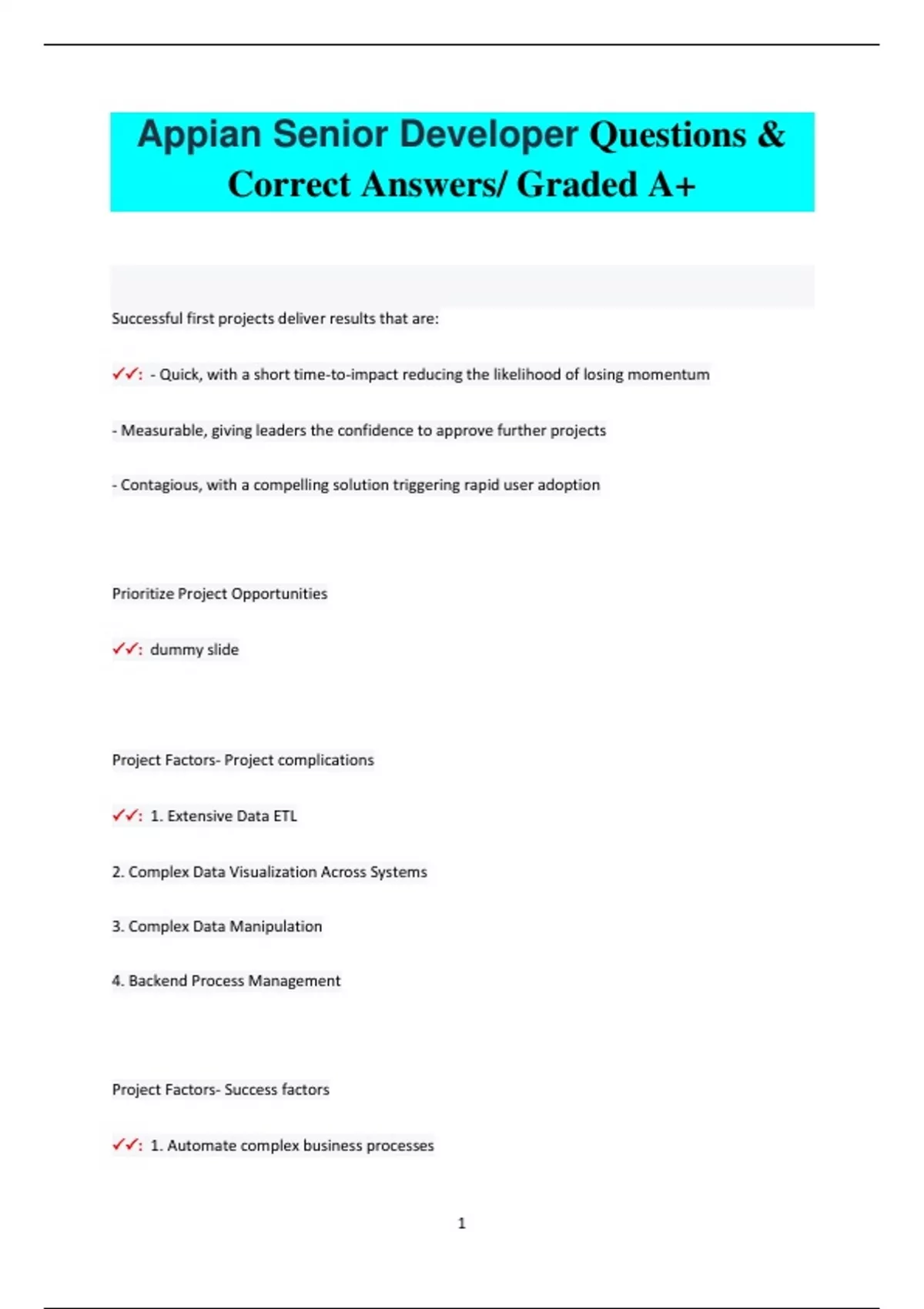 Successful first projects deliver results that are: : - Quick, with a short time-to-impact reducing the likelihood of losing momentum - Measurable, giving leaders the confidence to approve further projects - Contagious, with a compelling solution triggering rapid user adoption Prioritize Project Opportunities : dummy slide Project Factors- Project complications : 1. Extensive Data ETL 2. Complex Data Visualization Across Systems 3. Complex Data Manipulation 4. Backend Process Management Project Factors- Success factors : 1. Automate complex business processes 2 2. Access data from or send data to legacy systems 3. Create unified user experience across systems 4. Deliver functionality rapidly 5. Support business processes across the organization 6. Enable target users to access multiple systems 7. Integrate pre-built or custom-built AI systems 8. Engage or inform multiple stakeholders across workflows 9. Perform mobile data entry (inclusive of review and approval) Project Factors - First step to selecting a successful project : Finding oppertunities to address business processes If your project has large scsope, what is a best practice you can use that will lead to a successfull project? : Break up large scope into smaller projects Intergrations - HTTP Status code types : 100 - Informational 200 - Success 300 - Redirect 3 400 - Client Side Error 500 - Server Side Error Integrations - HTTP Status code 401 : Unauthorised Access Integrations - HTTP STatus Code 404 : Not found Integrations - Authendication - Two ways to configure authendication : 1. Connected Systems 2. Secure credentials Store Integrations-Authendication - Where can Secure Credentials Store configured : Appian Admin Console Integrations-Authendication - Expression function - Access Secure Credentials Store : a!scsField Integrations - Node used to call integrations from process mo