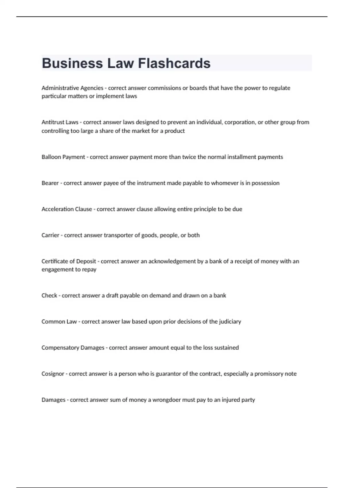 business law Collin College -Business Law Flashcards fully solvedAdministrative Agencies - correct answer commissions or boards that have the power to regulate particular matters or implement laws Antitrust Laws - correct answer laws designed to prevent an individual, corporation, or other group from controlling too large a share of the market for a product Balloon Payment - correct answer payment more than twice the normal installment payments Bearer - correct answer payee of the instrument made payable to whomever is in possession Acceleration Clause - correct answer clause allowing entire principle to be due Carrier - correct answer transporter of goods, people, or both Certificate of Deposit - correct answer an acknowledgement by a bank of a receipt of money with an engagement to repay Check - correct answer a draft payable on demand and drawn on a bank Common Law - correct answer law based upon prior decisions of the judiciary Compensatory Damages - correct answer amount equal to the loss sustained Cosignor - correct answer is a person who is guarantor of the contract, especially a promissory note Damages - correct answer sum of money a wrongdoer must pay to an injured party