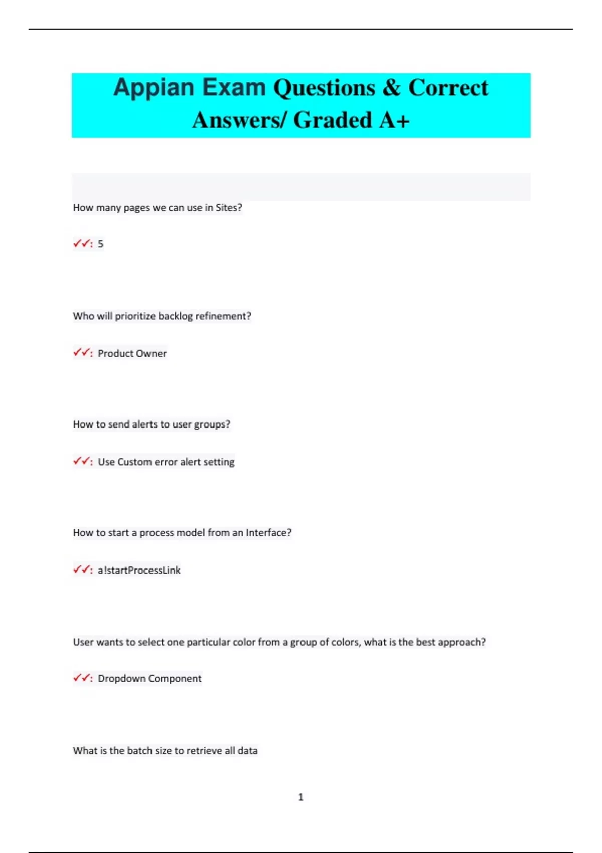 How many pages we can use in Sites? : 5 Who will prioritize backlog refinement? : Product Owner How to send alerts to user groups? : Use Custom error alert setting How to start a process model from an Interface? : a!startProcessLink User wants to select one particular color from a group of colors, what is the best approach? : Dropdown Component What is the batch size to retrieve all data 2 : -1 What is the lowest level of permission required to delete a folder? : Administrator Which environment is most common for user acceptance testing? : Staging environment In the life cycle of scrum master, what is the definition of ready? : A list of criteria that a user story needs to meet in order to be added to a sprint. A product owner and some or all of the team are reviewing our planning to the product owner's feedback. Which Agile ceremony is being described? : Sprint Planning Most accurate reason to use database view? : Views definition automatically update when dependent data structure tables are changed When should you select the option to Create a new version of the XSD file? : When datatype (CDT) configurations are not acceptable through a datatype CDT designed 3 Primary key contains null values? T/F : False You want users to get back-to-back tasks, what will you apply in-process model? : Activity chaining You want to generate documentation for a process model which two security permission can achieve this? : Editor and Administrator If you enable more than one language in the user input task : configure the form tab of the task in each language Which statement regarding starting a process is true