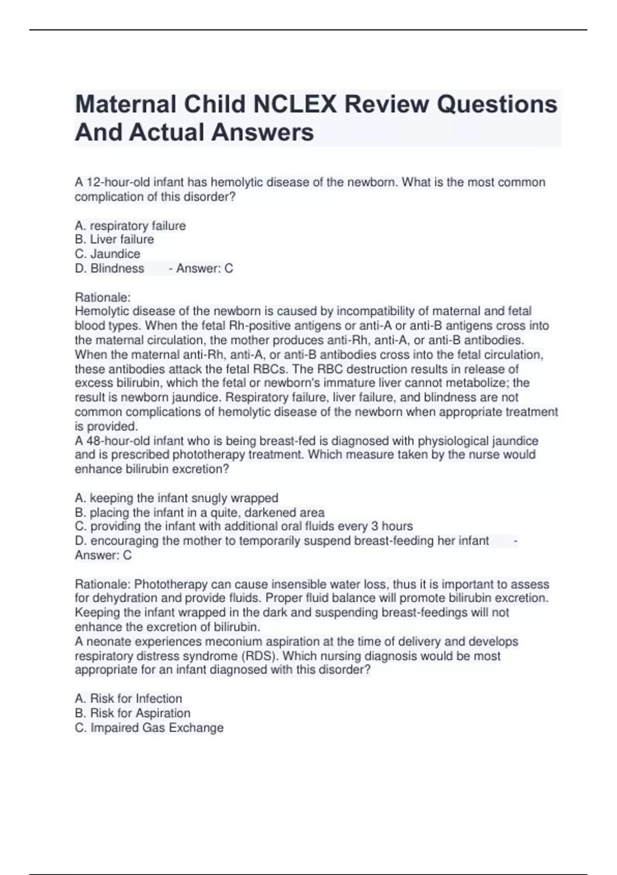 Maternal Child NCLEX Review Questions And Actual Answers A 12-hour-old infant has hemolytic disease of the newborn. What is the most common complication of this disorder? A. respiratory failure B. Liver failure C. Jaundice D. Blindness - Answer: C Rationale: Hemolytic disease of the newborn is caused by incompatibility of maternal and fetal blood types. When the fetal Rh-positive antigens or anti-A or anti-B antigens cross into the maternal circulation, the mother produces anti-Rh, anti-A, or anti-B antibodies. When the maternal anti-Rh, anti-A, or anti-B antibodies cross into the fetal circulation, these antibodies attack the fetal RBCs. The RBC destruction results in release of excess bilirubin, which the fetal or newborn's immature liver cannot metabolize; the result is newborn jaundice. Respiratory failure, liver failure, and blindness are not common complications of hemolytic disease of the newborn when appropriate treatment is provided. A 48-hour-old infant who is being breast-fed is diagnosed with physiological jaundice and is prescribed phototherapy treatment. Which measure taken by the nurse would enhance bilirubin excretion? A. keeping the infant snugly wrapped B. placing the infant in a quite, darkened area C. providing the infant with additional oral fluids every 3 hours D. encouraging the mother to temporarily suspend breast-feeding her infant - Answer: C Rationale: Phototherapy can cause insensible water loss, thus it is important to assess for dehydration and provide fluids. Proper fluid balance will promote bilirubin excretion. Keeping the infant wrapped in the dark and suspending breast-feedings will not enhance the excretion of bilirubin. A neonate experiences meconium aspiration at the time of delivery and develops respiratory distress syndrome (RDS). Which nursing diagnosis would be most appropriate for an infant diagnosed with this disorder? A. Risk for Infection B. Risk for Aspiration C. Impaired Gas Exchange D. Dysfunctional Ventilatory Weaning Response - Answer: C Rationale: Impaired gas exchange is the most appropriate nursing diagnosis because meconium aspiration interferes with the exchange of O2 and CO2. Risk for infection is present but is not as high a priority as impaired gas exchange. Risk for aspiration has already occurred. Dysfunctional ventilatory weaning response may be appropriate i the newborn demonstrates difficulty with the ventilatory weaning process A neonate weights 8 lb, 1 oz at birth. At age 3 days, the weight has decreased to 7 lb, 12 oz. The nurse should instruct the mother to: A. increase the amount of formula to prevent further dehydration and weight loss B. continue feeding on demand because the noted weight loss is within normal limits C. give additional feedings because the weight loss indicates inadequate caloric intake D. switch to a different formula because the current one is inadequate to maintain weight - Answer: B Rationale: Neonates tend to lose 5% -- 10% of their birth weight during the first few days after birth, mostly because of decreased, but acceptable, nutrition and extracellular fluid loss. Increasing formula volumes and feedings or changing the formula is not necessary in this situation. A new father observes his newborn infant receiving a vitamin K injection and asks the nurse, "Why did my son need a shot?" The nurse's response should be based on the understanding that infants: A. need vitamin K to stimulate liver maturation B. cannot get enough vitamin K from their feeeings C. have a sterile intestinal tract and cannot synthesize vitamin K D. are often born with hypokalemia, which responds to vitamin K therapy - Answer: C Rationale: