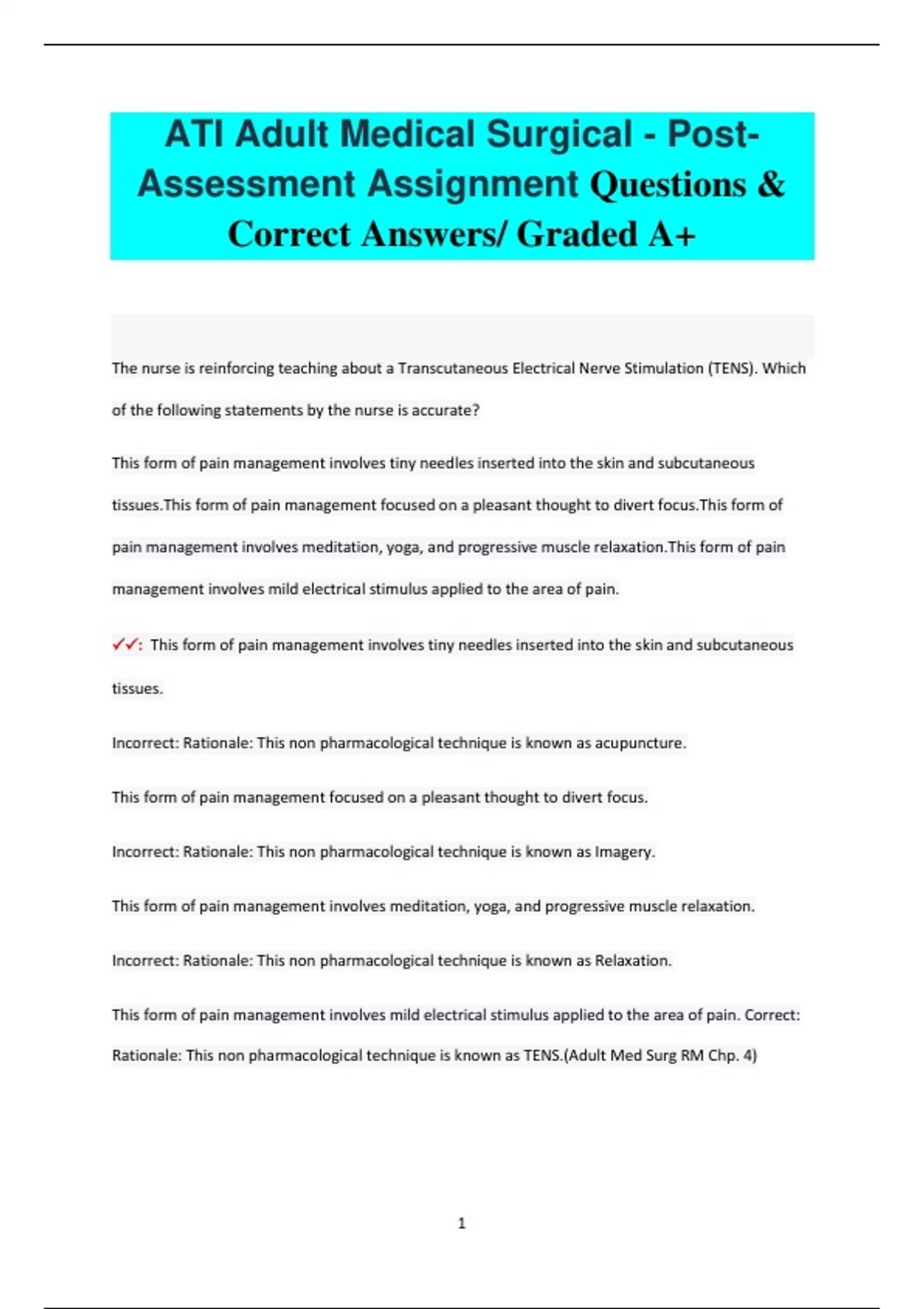 The nurse is reinforcing teaching about a Transcutaneous Electrical Nerve Stimulation (TENS). Which of the following statements by the nurse is accurate? This form of pain management involves tiny needles inserted into the skin and subcutaneous tissues.This form of pain management focused on a pleasant thought to divert focus.This form of pain management involves meditation, yoga, and progressive muscle relaxation.This form of pain management involves mild electrical stimulus applied to the area of pain. : This form of pain management involves tiny needles inserted into the skin and subcutaneous tissues. Incorrect: Rationale: This non pharmacological technique is known as acupuncture. This form of pain management focused on a pleasant thought to divert focus. Incorrect: Rationale: This non pharmacological technique is known as Imagery. This form of pain management involves meditation, yoga, and progressive muscle relaxation. Incorrect: Rationale: This non pharmacological technique is known as Relaxation. This form of pain management involves mild electrical stimulus applied to the area of pain. Correct: Rationale: This non pharmacological technique is known as TENS.(Adult Med Surg RM Chp. 4) 2 A nurse is reinforcing teaching for a client with hypertension about the importance of compliance with antihypertensive therapy. What are three (3) complications that can occur with prolonged, untreated or poorly controlled hypertension? : Complications associated with Hypertension:Peripheral vascular disease that primarily affectsHeart (Myocardial infarction)Brain (Cerebral Vascular Accident)Eyes (Blindness)Kidneys (Renal insufficiency and Renal Failure)The risk of developing complications increases as blood pressure increases.Hypertrophy of the left ventricle can develop as the heart pumps against resistance caused by the hypertension.(Medical Surgical RM Chp. 31) The nurse is reinforcing teaching about foot care to the diabetic client. Which of the following statements should the nurse make?A. "Remove any calluses or corns when they develop."B. "Do not use any foot powder as a remedy for sweating feet." C. "Apply lotion to feet and in between toes to keep skin soft." D. "The best time to perform nail care is after a bath or shower." : D. "The best time to perform nail care is after a bath or shower."Correct: Rationale: Toenails are soft and easier to trim after a bath or shower.(Medical Surgical RM Chp. 72) The nurse is reinforcing teaching regarding the risk of hip dislocation. Describe symptoms the client might experience with this complication : Acute onset of pain; client's report of hearing a "pop"; internal rotation of the affected extremity; shortened affected extremity.(Medical Surgical RM Chp. 6